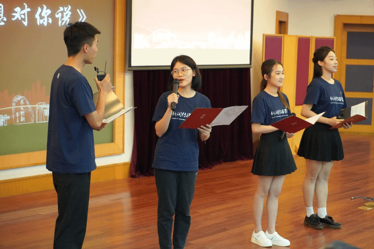 2023级博士新生刘思聪、2023级硕士新生邝益铭和蒋洁以及2022级本科新生李橘为全体师生带来朗诵节目,诉说他们对新闻传播学院的满腔炽热之情。