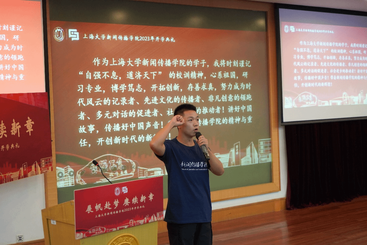 兰勇同学既是一名硕士新生,也是一位退伍军人。在他的带领下,会场内的同学们举起右手,庄严宣读新闻传播学院学生入学誓词。一代人有一代人的使命和征途,全体新生用铿锵誓言传递了新传学子立志求学的决心和信心,也表现了新传学子勇挑时代重担,不惧艰险,在浪潮中开创未来的气概与雄心。
