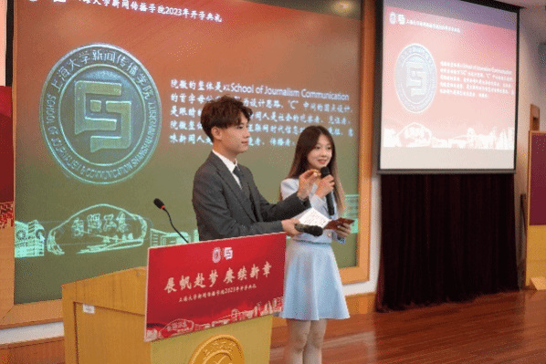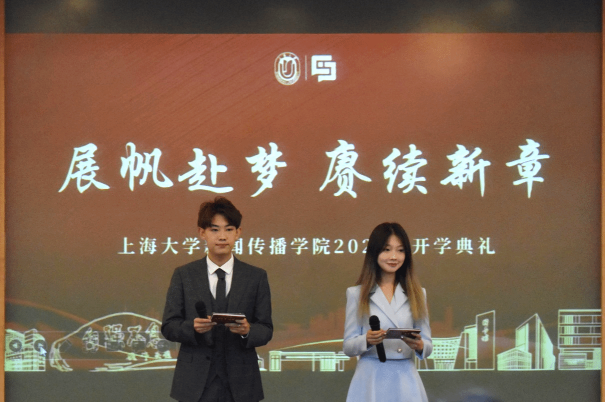 出席此次开学典礼的有新闻传播学院党委书记王晴川,学院党委副书记、院长严三九,学院党委副书记、副院长王智君,副院长赵为学,副院长牛盼强,上海研究院世界传媒研究中心执行主任吴信训教授,新闻传播系张咏华教授,广告学系查灿长教授,智能传播系负责人王虎,智能视听系支部书记刘峰,智能视听系负责人虞国芳,以及专业教师代表、班主任、辅导员、行政老师等,一起见证了新生入学这一重要时刻。本次开学典礼由2023级新闻与传播硕士研究生于昊岑与2022级广播电视学本科生肖芸主持。