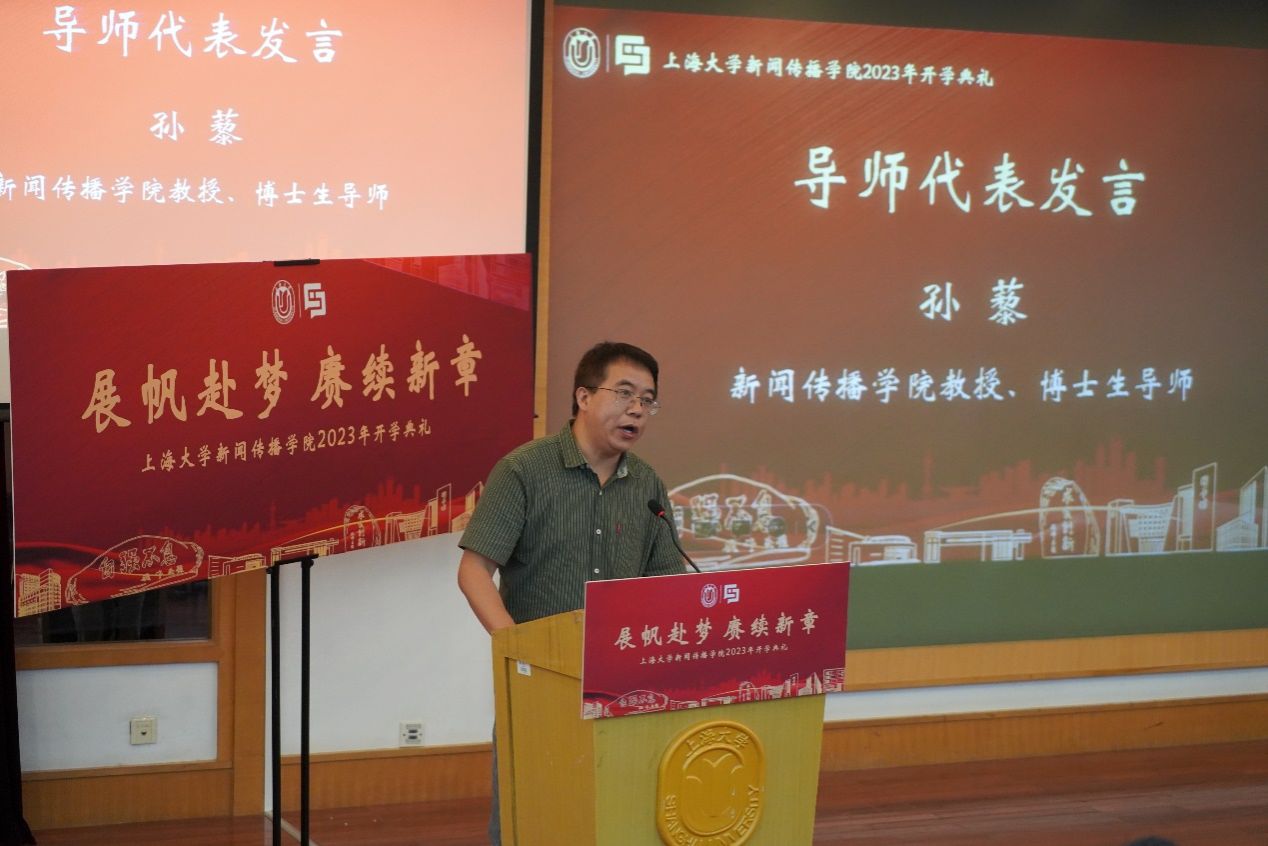 新闻传播学院新闻传播学系孙藜老师作为导师代表在开学典礼上发言。他指出,当前媒体形势不断变化,元宇宙与各种智能媒体的不断涌现,报纸的生存危机以及自媒体行业的不断繁荣,对于新闻传播者们而言,无疑是一个巨大的挑战。而当下碎片化时代所带来的思维上的弊端也是显而易见的。孙藜老师希望同学们在今后的学习中,把握好学习节奏,收获一段多姿多彩的学习生活。