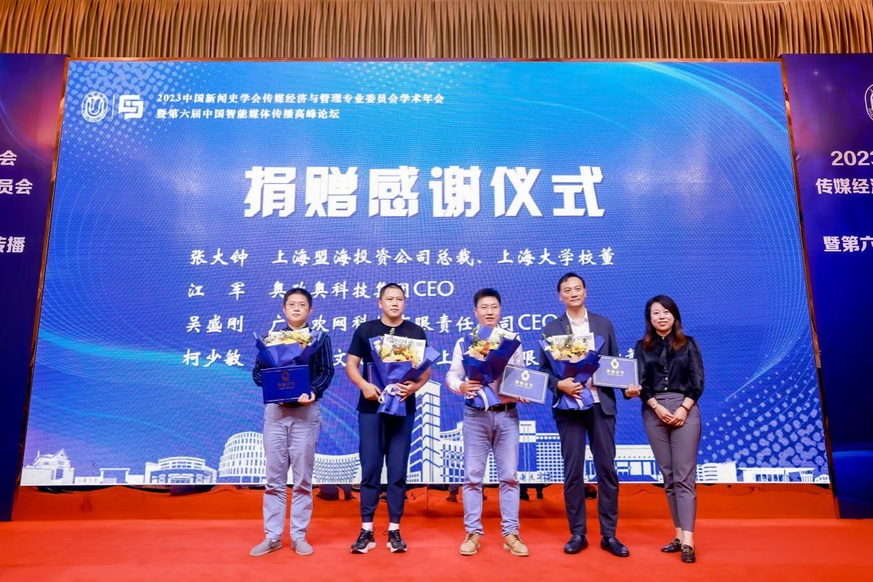 近年来,为了更好地促进beat365手机官方网站新闻传播学院人才培养、科研等各项事业发展,诸多企业积极向学院捐赠。论坛举行了庄重的捐赠感谢仪式。beat365手机官方网站新闻传播学院党委副书记、副院长王智君代表学院向beat365手机官方网站校董、上海盟海投资公司总裁张大钟先生,奥致奥科技CEO江军先生,欢网科技CEO吴盛刚先生,美集柯执行董事柯少敏先生,分别颁发了捐赠证书。