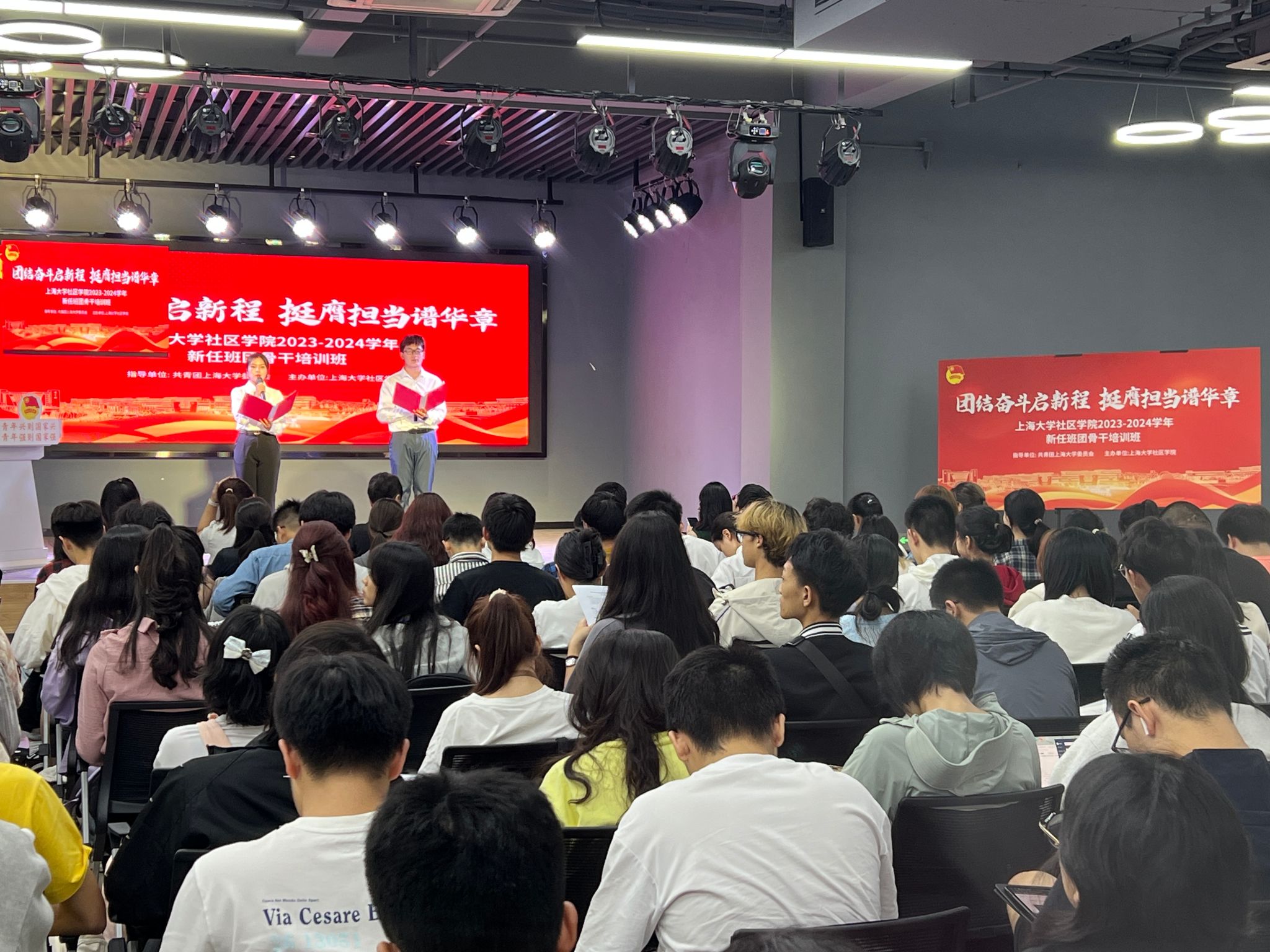 9月22日晚,2023-2024学年beat365手机官方网站新任班团骨干培训社区学院办学点开班仪式于beat365手机官方网站宝山校区学生创新创业实践基地309青春剧场举行。社区学院院长尹静波,社区学院党委副书记、副院长佟丽宁,社区学院团干部薛赛男、胡雅、廖香园、于亚静、薛卜真与135位班团骨干和29名推优一体化学生参加了开班仪式。