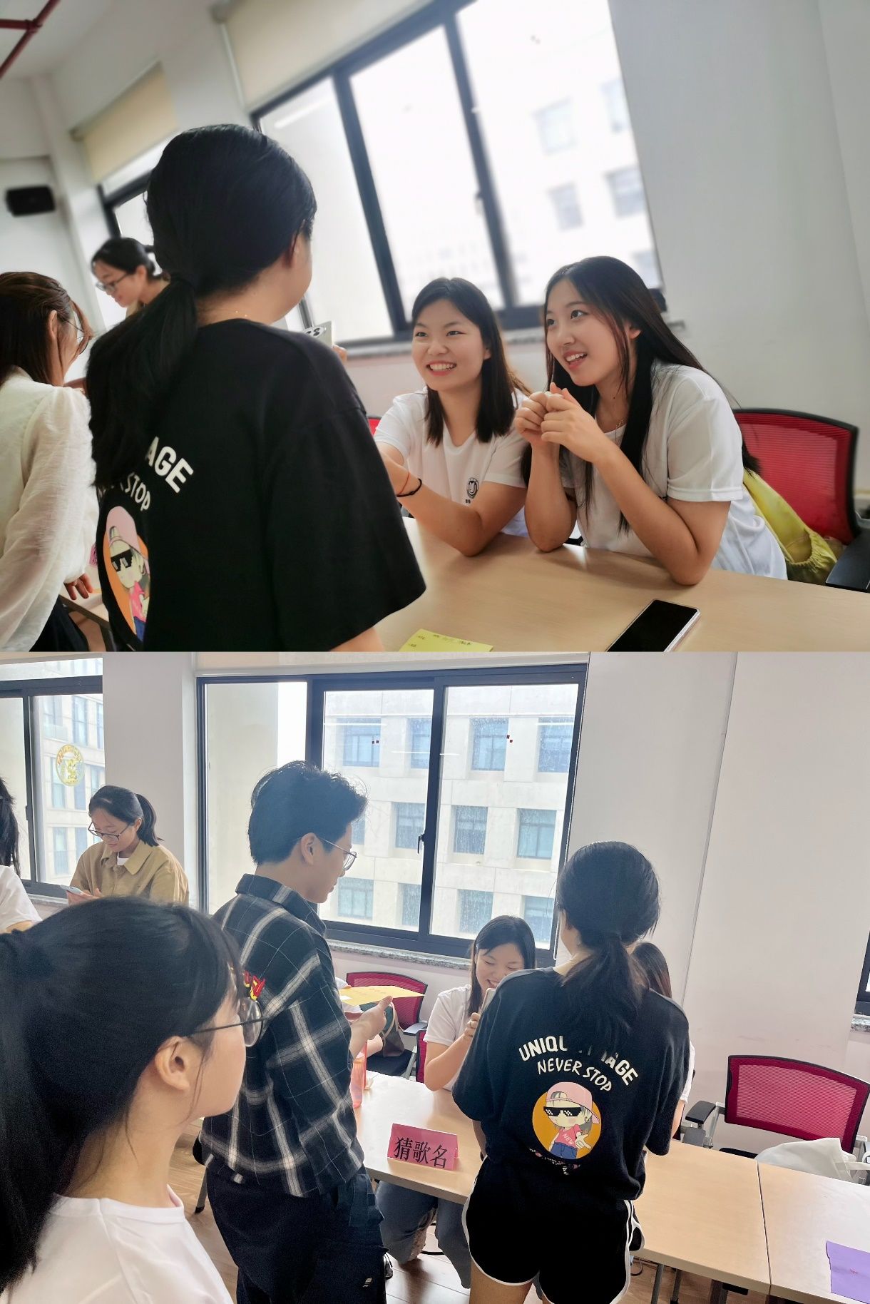 从传统民俗活动中走出,用音乐放松一下被灯谜“烧热”的大脑。这一区域同学们通过聆听伴奏猜测所放歌曲的歌名,考验同学们歌曲储备量的时候到了。大家参与踊跃,有的歌曲耳熟能详,前奏一出便激起千层浪花,其他游戏区域也成了音乐的海洋。大家“胜负欲”爆棚,“中华小曲库”的称号在每个人身上流转。