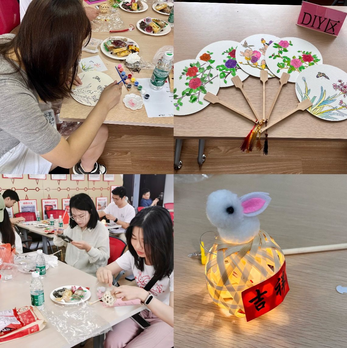 这个区域准备了中秋灯笼与团扇材料包,大家可以在该区域中挑选自己喜欢的灯笼或团扇样式,按照材料包中的步骤完成制作。赏灯是中秋的习俗之一,中秋节看花灯寓意着幸福团圆。而团扇也象征月亮,古人云“裁为合欢扇,团团似明月”,中秋佳节之际,一柄团扇寄托思念和团圆。同学们一个个都心灵手巧,精心制作,让我们来展示一下大家的成果!