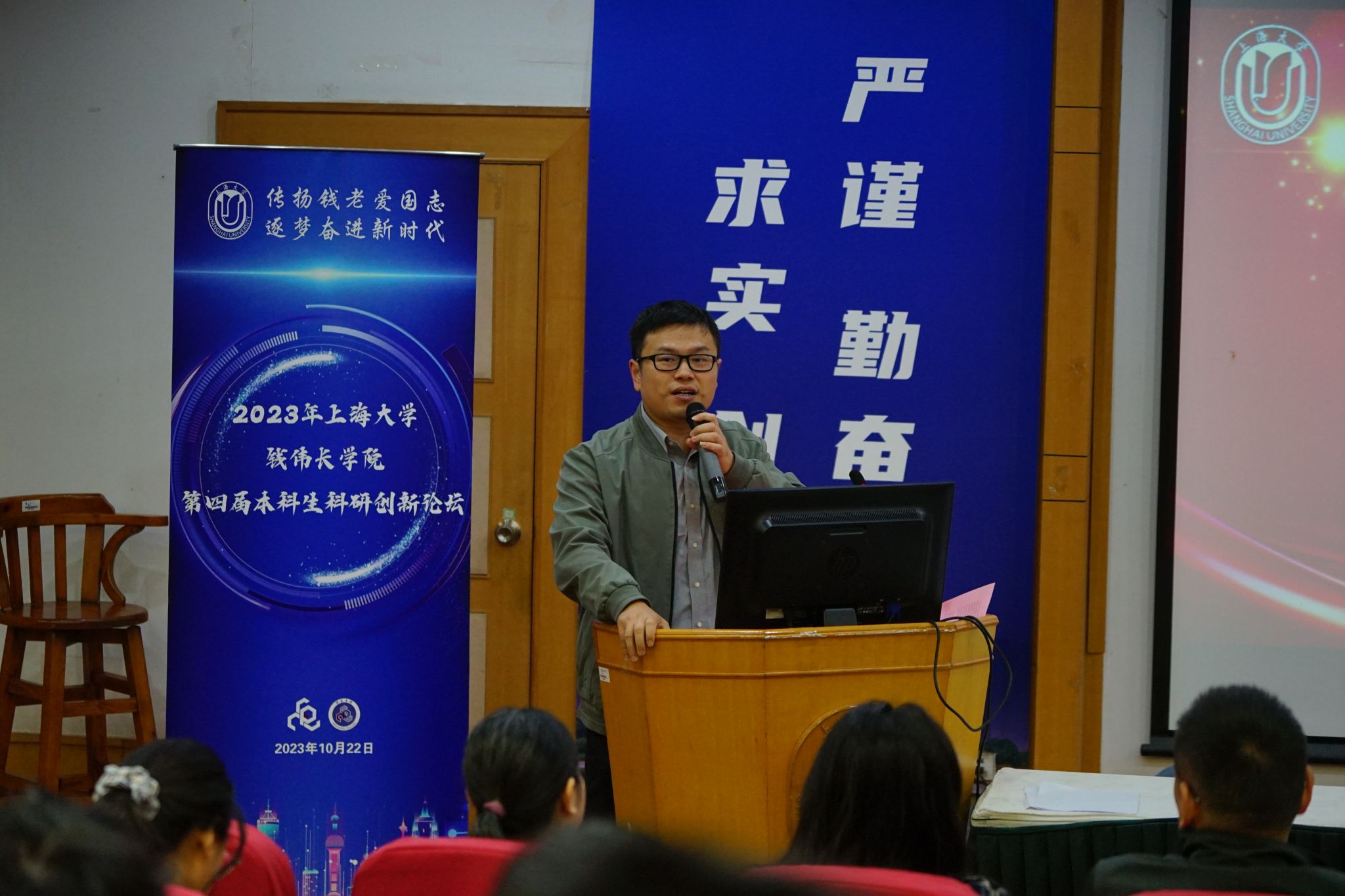 10月22日上午,“传扬钱老爱国志,逐梦奋进新时代”2023年beat365手机官方网站钱伟长学院第四届本科生科研创新论坛在校本部J楼隆重举行。上海交通大学郑杭教授,复旦大学魏益民教授,华东师范大学施毅研究员,同济大学刘睿教授、韦萍教授,上海理工大学顾长贵教授,上海应用技术大学邱翔教授,鸿之微科技(上海)股份有限公司副总经理龚奎、高级工程师孙旸云丽等专家应邀担任评委。同时,论坛还邀请到了首届国家自然科学基金青年学生基础研究项目获得者复旦大学本科生单佳骊和上海交通大学本科生孔淇,以及钱伟长学院本科生闫雪涛作学生科研经验分享。钱伟长学院党委书记、校团委书记冯凌燕,钱伟长学院党委副书记、院长周全,钱伟长学院副院长许新建,钱伟长学院各年级学生出席了本次论坛。论坛由钱伟长学院党委副书记、副院长沈青松主持。