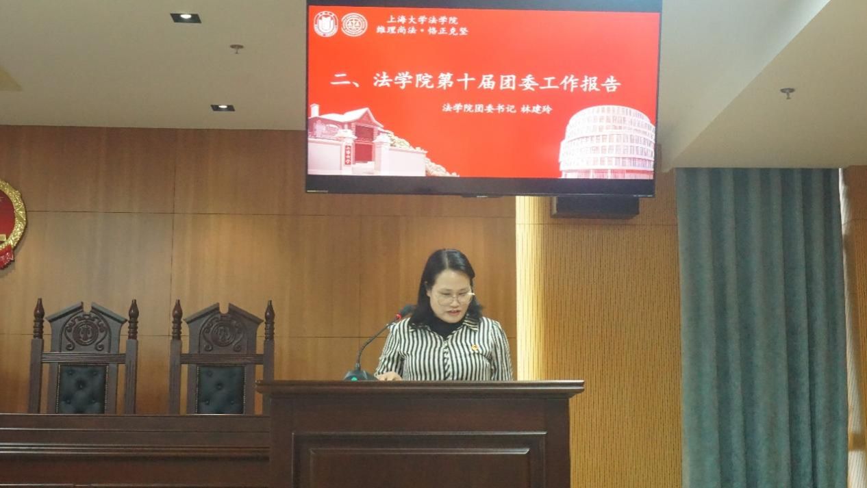 由法学院团委书记林建玲老师作题为《在民族复兴新征程上绽放青春梦想为培养敢想敢为、善作善成的新时代好青年而努力奋斗》的法学院第十届团委工作报告。
