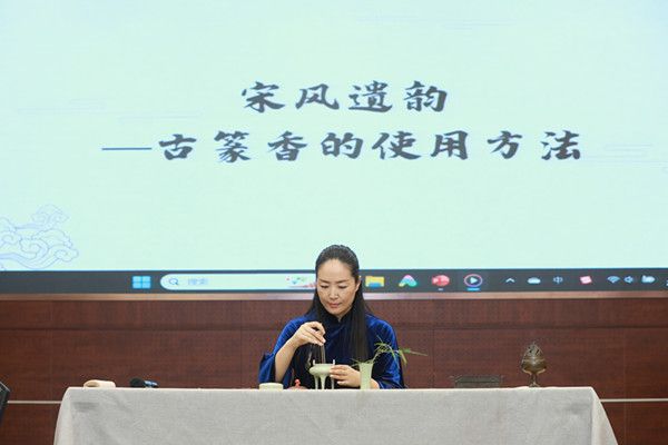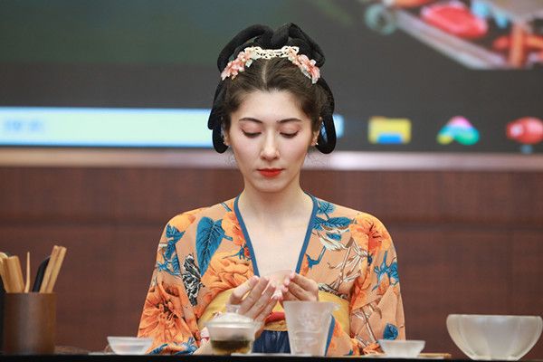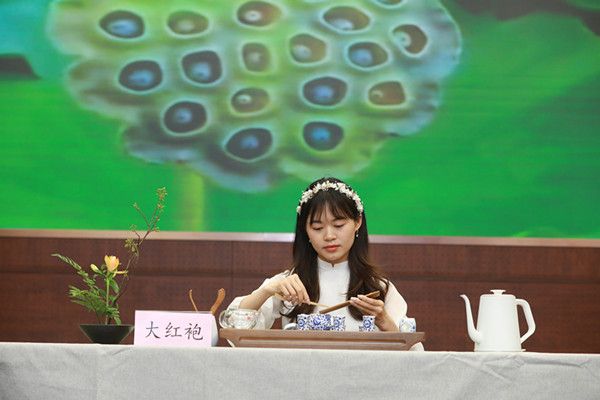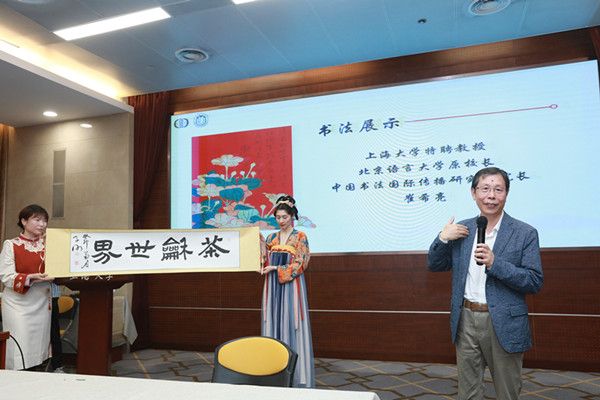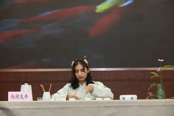 茶会活动中安排了丰富多彩的文艺表演,我校来自俄罗斯、越南和阿塞拜疆的国际留学生身着汉服进行了红茶(正山小种)、乌龙茶(大红袍)以及绿茶(西湖龙井)的茶艺表演,典雅的音乐,清新的背景,伴随着茶香,使茶会氛围更加古韵悠长。本次活动还邀请了青年琉璃艺术家郑珊珊介绍琉璃茶器,非遗传承人高晴介绍中国香道以及非遗传承人王薇介绍中国插花。最后由崔希亮教授的书法展示“茶和世界”将本场活动推向高潮。