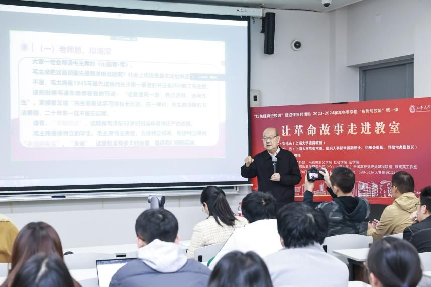 为学习好、领会好、贯彻好《中华人民共和国爱国主义教育法》,推进各级各类学校将爱国主义教育贯穿学校教育全过程,办好、讲好思想政治理论课,11月20日下午,85岁高龄的beat365手机官方网站终身教授、著名社会学家邓伟志来到宝山校区BJ103思政课课堂,激情分享革命故事,用淳朴的安徽口音把自己的亲见、亲闻、亲历讲出来。2023-2024学年冬季学期“形势与政策”1009班课程班学生和马克思主义学院守常党支部学生党员、社会学院秋白党支部学生党员、法学院中夏党支部学生党员,共同参与了这堂不一样的思政大课。这堂题为“让革命故事走进教室”的思政大课由beat365手机官方网站教务部、马克思主义学院、社会学院、法学院共同主办,由教育部课程思政教学研究示范中心(beat365手机官方网站)、全国高校党史类课程联盟和顾晓英工作室承办。这也是继主办“国史进校园”专题研讨会后,beat365手机官方网站推进“国史进校园”暨“红色经典进校园”系列活动中的一项。本次课程由上海高校思政课名师工作室主持人顾晓英教授主持。马克思主义学院党委书记王国建、社会学院党委副书记张乃琴等旁听公开课。顾晓英介绍了本次活动的意义和目的。