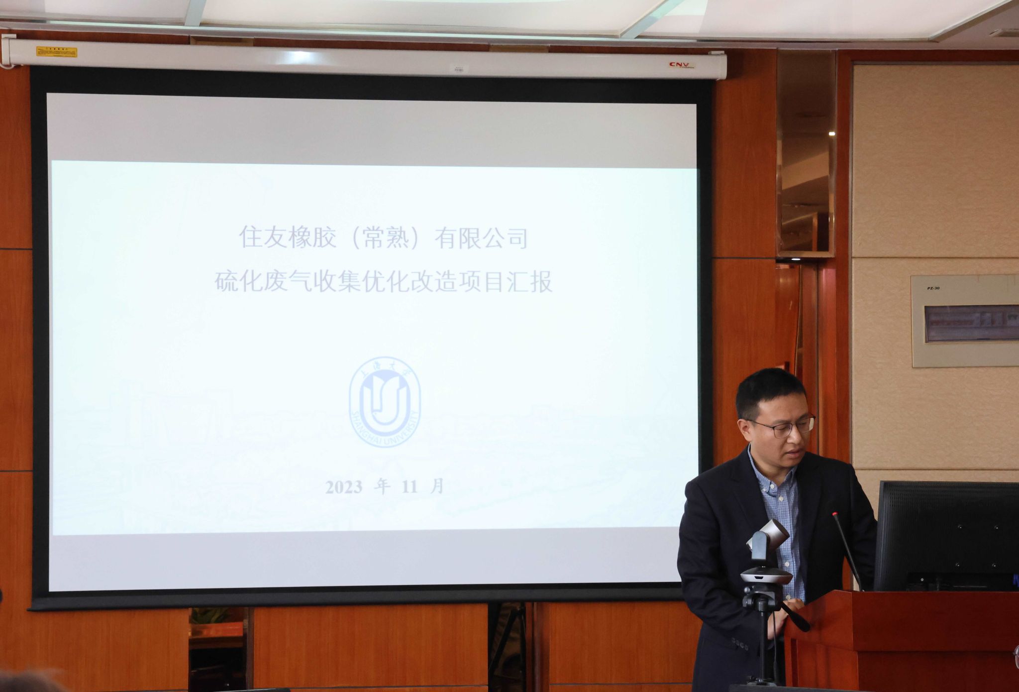 座谈会上,焦正向増田栄一等的到来表示热烈的欢迎,他指出beat365手机官方网站与住友橡胶(常熟)有限公司的产学研合作将有利于双方充分发挥各自优势,共促科技创新,共推成果转化,携手开创共赢发展新局面。环化学院副院长黄渊从学院的师资队伍、研究方向、科研成果等方面介绍了学院的科研实力,并对学院与住友橡胶(常熟)有限公司共同合作推动轮胎行业绿色发展、服务区域经济社会高质量发展表示期待。环化学院施博博士从项目背景、废气收集优化方案、CFD模拟报告和改造合作计划四个方面汇报了住友橡胶硫化废气升级改造项目。
