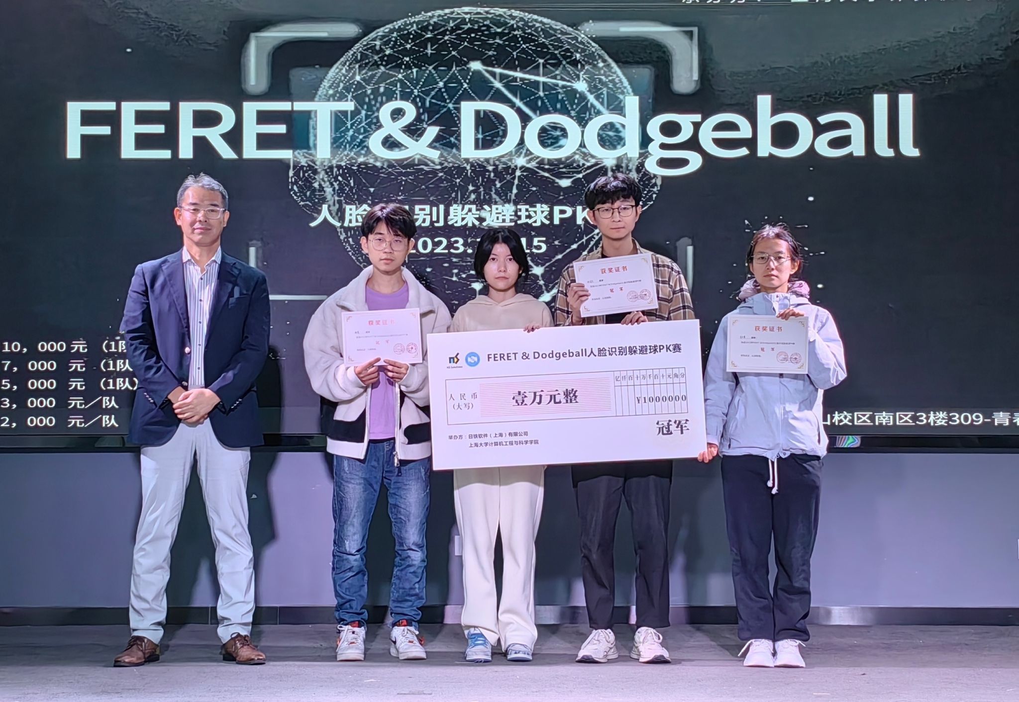 2023年12月15日下午,由beat365手机官方网站计算机学院与日铁软件(上海)有限公司联合举办的FERET & Dodgeball人脸识别躲避球PK赛在beat365手机官方网站南区三楼青春剧场顺利举办。计算机学院党委副书记、副院长赖练,副院长李晓强,日铁软件(上海)有限公司董事总经理田中公二,管理总括部副总括部长张韬,技术顾问小岛一仁出席比赛。竞赛由计算机学院研究生赵宸、本科生段昕怡主持。
