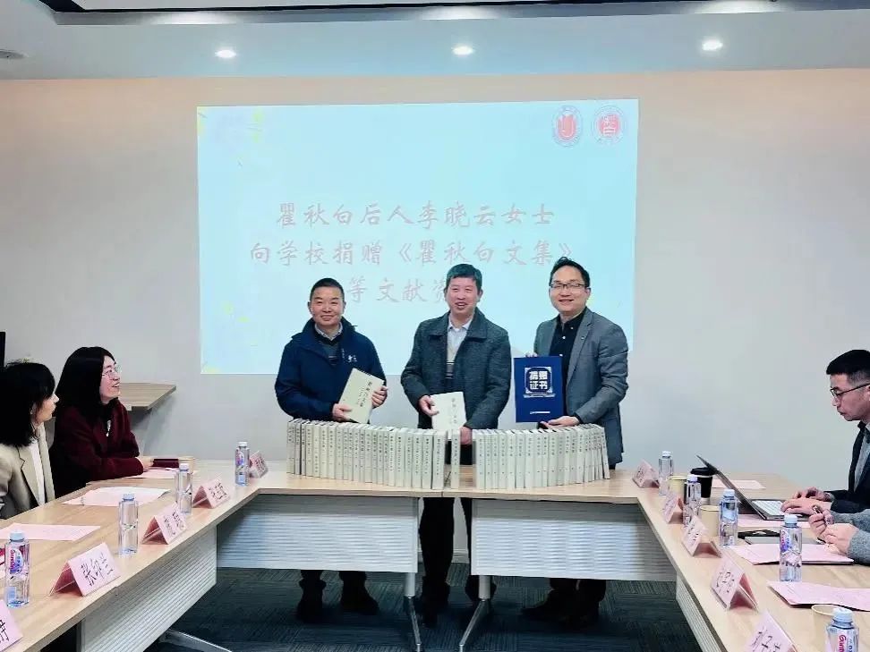 近日,瞿秋白后人李晓云女士向beat365手机官方网站捐赠文献仪式在临泮轩校友活动中心举行。对外联络处处长陈然代表瞿秋白后人李晓云女士,向学校捐赠《瞿秋白文集》等珍贵文献,图博档党委书记王远弟和秋白书院院长肖瑛接受赠书。