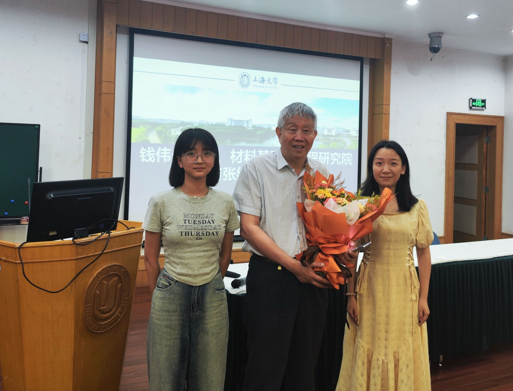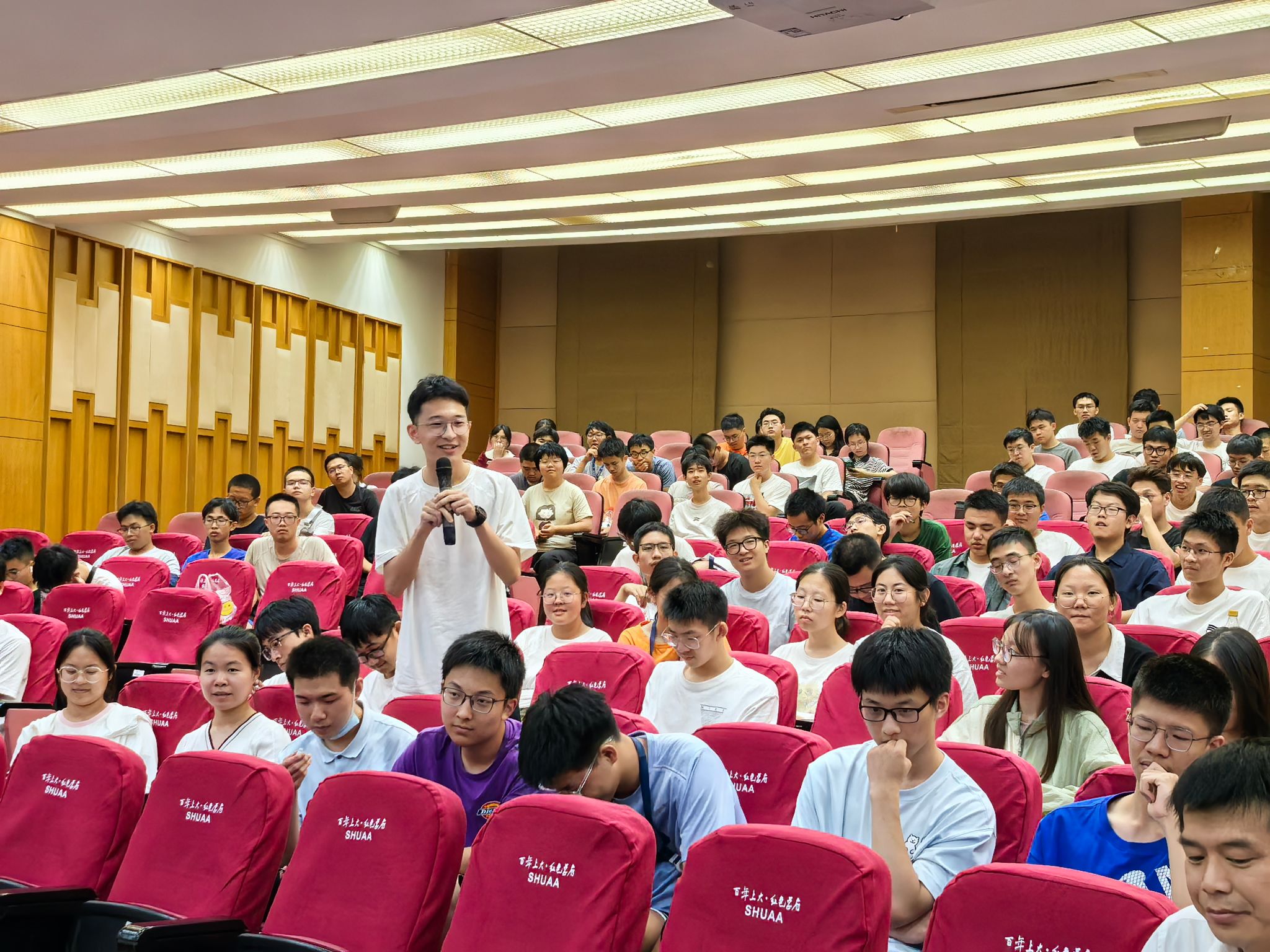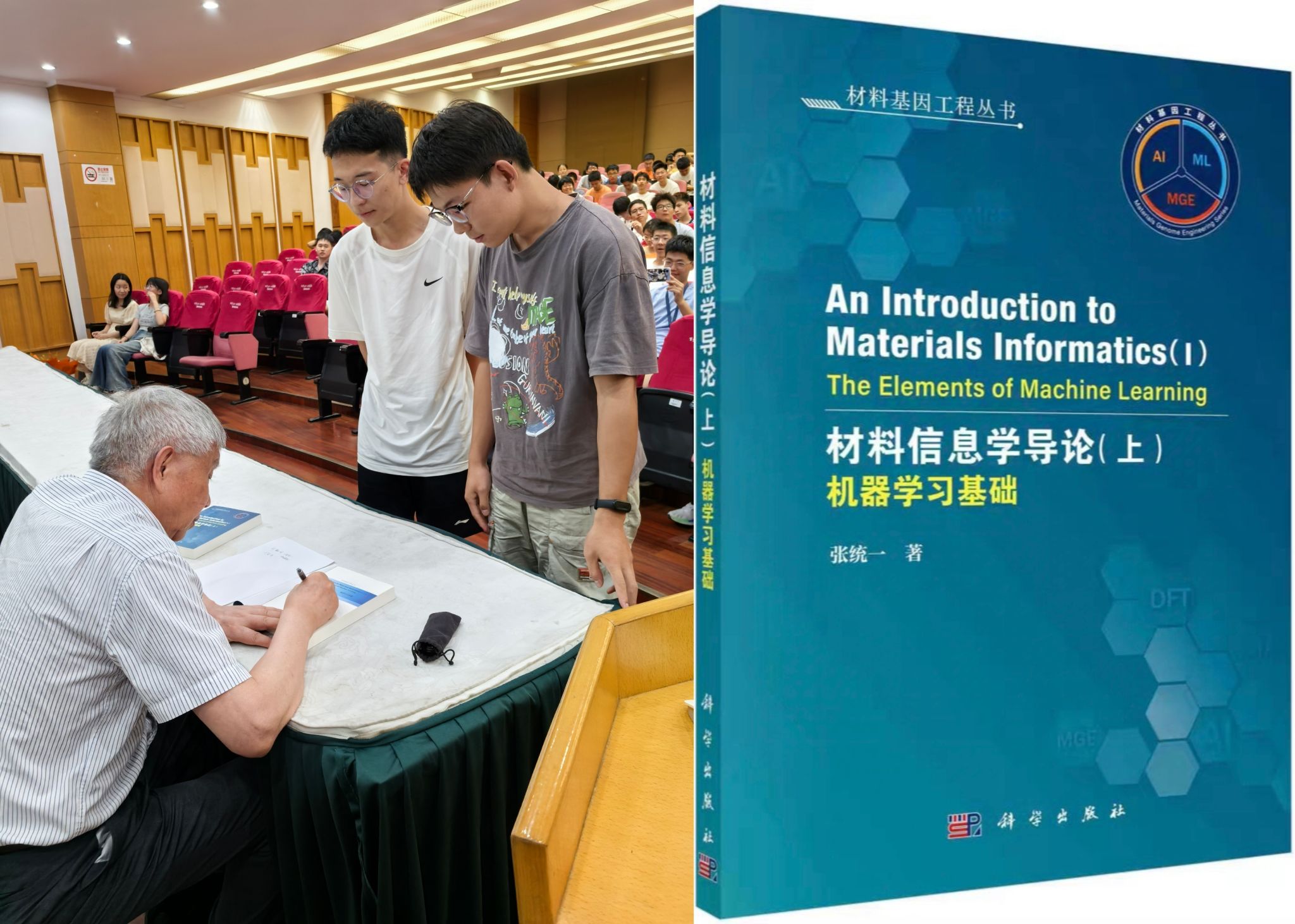在互动环节,现场气氛热烈,同学们踊跃提问。2024级本科新生刘瀚明同学对张统一院士的大学经历感到好奇,张院士结合时代背景,向大家详细介绍了自己的求学经历,给予了同学们极大的启发与鼓舞。材料基因组工程研究院的研究生新生刘金涛通过AlphaGo等AI智能的出现及影响为出发点,向张院士请教人工智能如何结合材料基因组研究对材料领域发展产生影响及其程度。张院士进行了详细的回答并强调了材料设计的重要性,并以具体研究案例展示材料与AI结合的重要意义。张院士向两位积极提问的同学赠送了现场亲笔签名的新书《材料信息学导论》并合影留念。