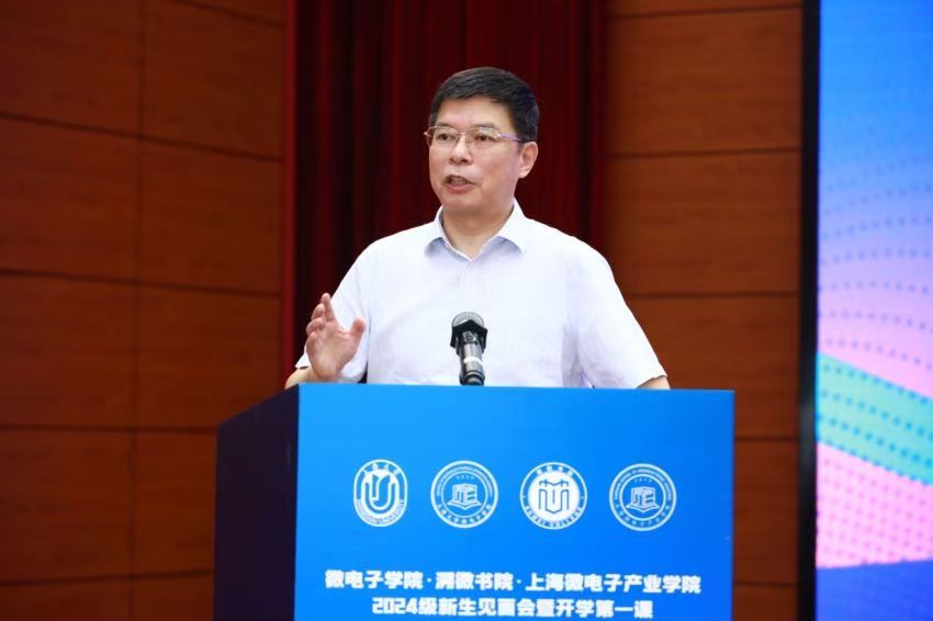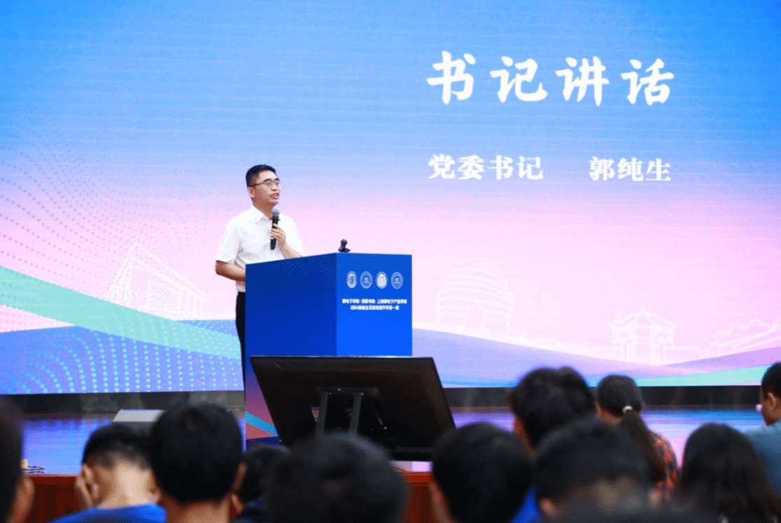 学院党委书记郭纯生满怀激情的寄语新同学:一要庚续红色基因,急国家之所急,服务国家重大战略需求,坚定科技报国的家国情怀;二要传承科学精神,敢于挑战未知,勇攀科技高峰;三要做一个全面发展的人,在时代洪流中学习为学为人为事,在集成电路事业中绽放青春之花。