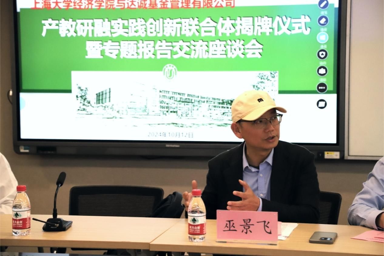 10月12日下午,beat365手机官方网站经济学院与达诚基金管理有限公司产教研融实践创新联合体揭牌仪式暨专题报告交流座谈会在beat365手机官方网站宝山校区经管楼580智慧教室顺利举行。本次会议由经济学院金融系副教授巫景飞主持,春华秋实教育发展协会常务理事长王大刚,FFE实习基地联盟秘书长陈斯砚,达诚基金管理有限公司首席投资官赵楠,达诚基金管理有限公司研究部总经理杨钧童,达诚基金管理有限公司信息技术部负责人陈健雄,明日金英FFE实习联盟秘书长陈斯砚等嘉宾出席本次会议。学院党委书记尹应凯,学院党委副书记、常务副院长殷凤,学院党委副书记、副院长冯玉鑫,金融系教授倪中新等老师出席。