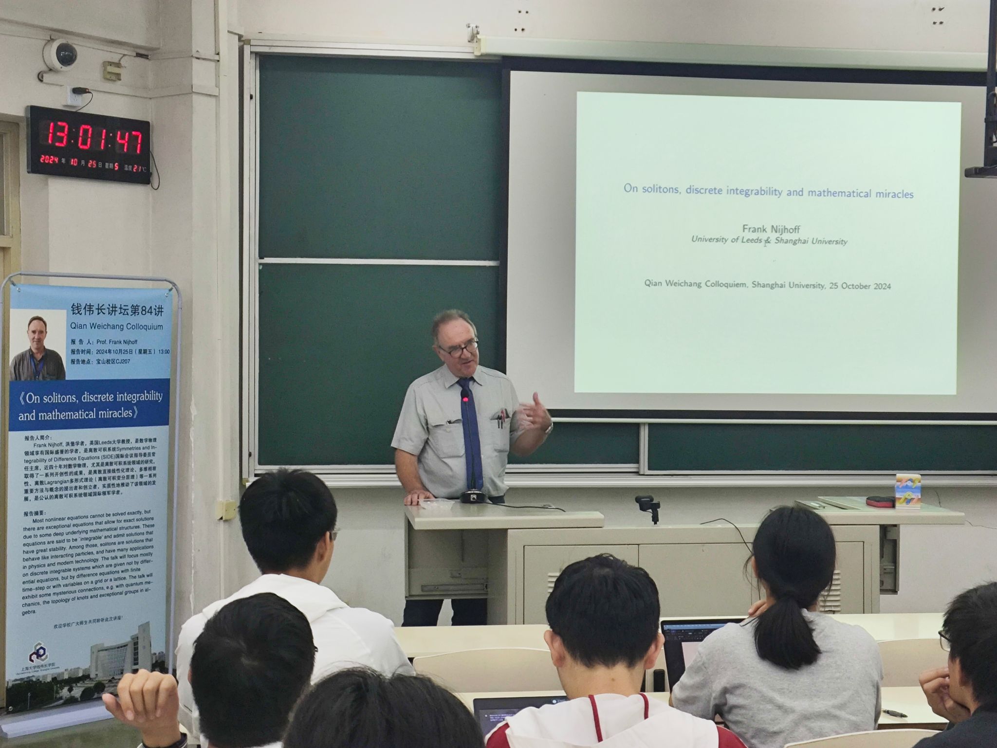 10月25日下午,钱伟长讲坛第84讲《On solitons, discrete integrability and mathematical miracles》在beat365手机官方网站宝山校区CJ207会议室顺利举行,国际著名的数学家Frank Nijhoff教授应邀作主题报告,讲坛由钱伟长学院副院长许新建教授主持,钱伟长学院团委书记魏仲奇和24级本科生等共同出席了本次活动。