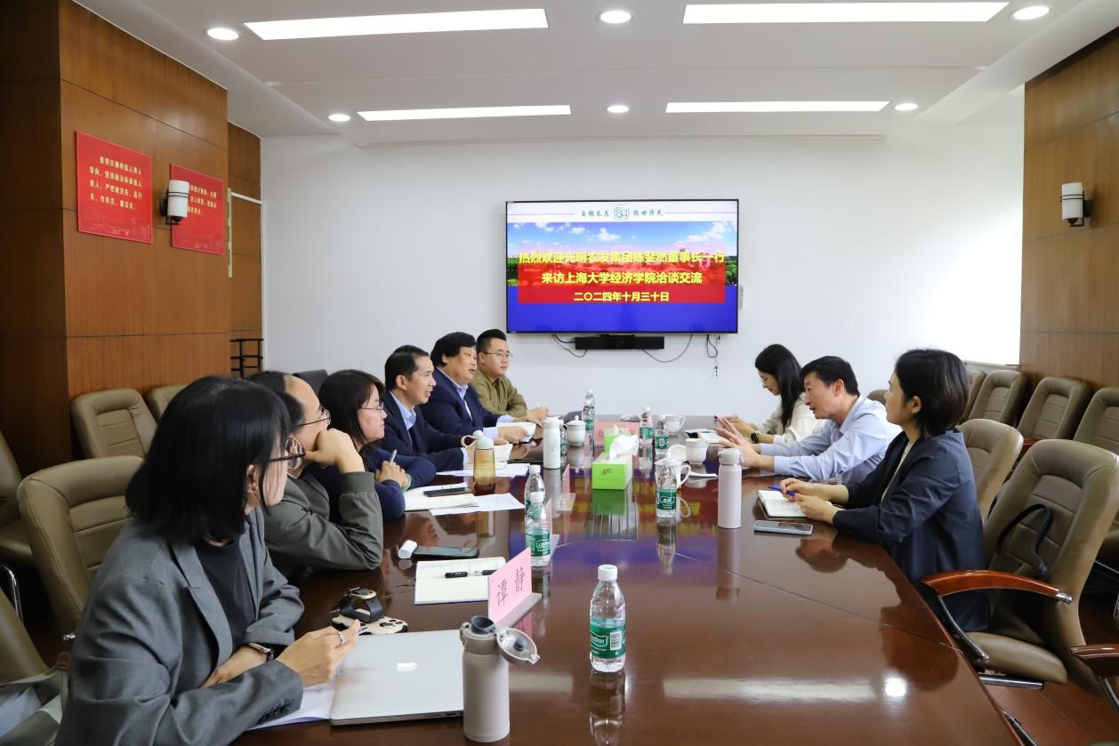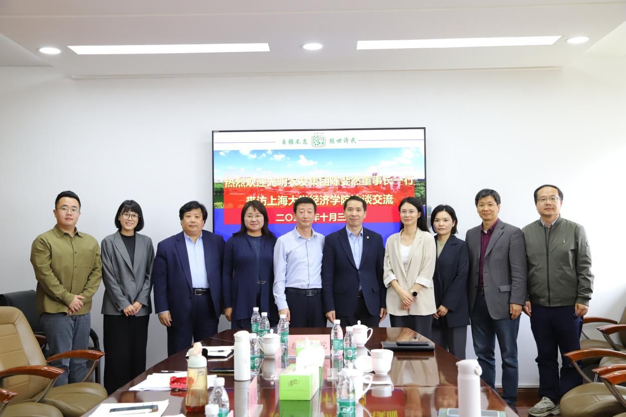 10月30日上午,光明农发集团党委书记、董事长陈斐然,党委副书记、纪委书记、工会主席严如娟,党委工作部部长王珍巧一行来访beat365手机官方网站经济学院洽谈交流。经济学院党委书记尹应凯,党委副书记、常务副院长殷凤,党委委员、聂永有教授,党委副书记、副院长冯玉鑫,党委委员、副院长刘康兵,党委委员、副院长谭静以及外联秘书杜天宇参加了本次交流座谈。
