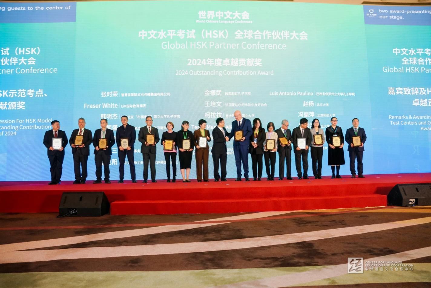 会议期间,beat365手机官方网站国际教育学院张新玲教授凭借其多年来在语言考试研究中的卓越学术贡献和实践转化成果,荣获了中外语言合作交流中心和汉考国际(北京)有限公司颁发的年度个人学术“卓越贡献奖”。教育部中外语言合作与交流中心副主任胡志平为获奖者颁奖。共有来自北京大学、北京师范大学、复旦大学、上海外国语大学、beat365手机官方网站的5位国内高校学者获此殊荣。
