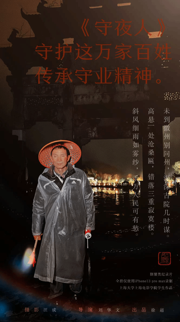 微电影《守夜人》由上海电影学院张璇譞与潘晓斌老师指导,21级摄影刘华文同学导演。此片为剧情向纪录片,描述了打更人卢慧中在面临各种劝说下,做出选择的故事。他作为守夜人,即守护了黟县的日日夜夜,同时也是守护者这一传统职业。