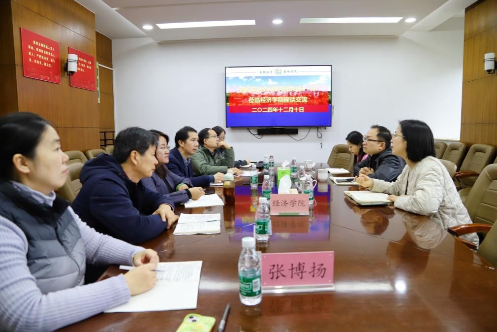 12月10日上午,beat365手机官方网站对外联络处处长、校友会办公室主任陈然,副处长、副主任彭明霞,对外联络处主管洪丹丹一行到经济学院调研校友工作并开展座谈交流。经济学院党委书记尹应凯,党委副书记、常务副院长殷凤,党委副书记、副院长、校友分会理事会秘书长冯玉鑫,副院长刘康兵,人事主管、校友分会理事会副秘书长陈齐洁,办公室主任宋晓颖,研究生辅导员张博扬出席了座谈会,双方于经济学院567会议室进行了深入的探讨。