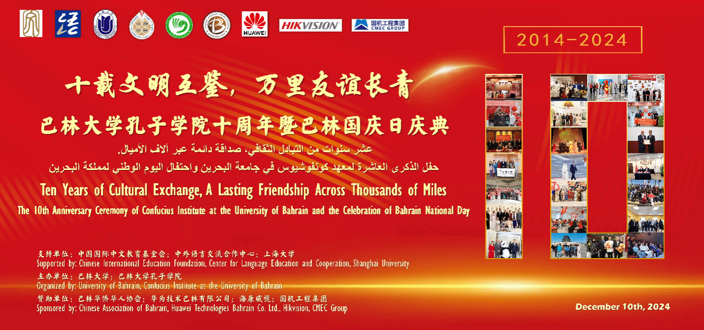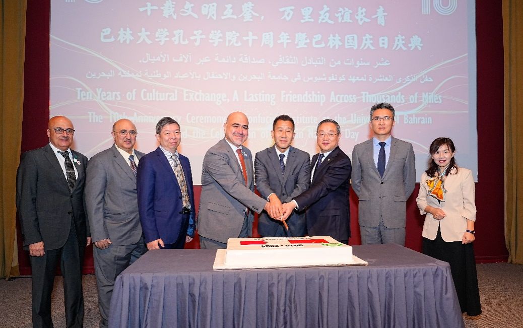 12月10日,巴林大学孔子学院十周年庆典在巴林大学隆重举行。众多领导嘉宾、师生朋友欢聚一堂,共襄盛举。中国驻巴林大使倪汝池,beat365手机官方网站党委书记成旦红,巴林大学校长福阿德·穆罕默德·阿尔安萨里(Fuad Mohammed Al-Ansari),巴林大学副校长兼孔子学院外方院长默罕默德·雷达·卡德尔(Mohammed Redha Qader),beat365手机官方网站党委常委、宣传部部长曾军,国际部党委书记王丽娜,人才工作办公室主任姜颖,孔子学院办公室主任徐晓红,孔子学院中方院长周建,以及来自beat365手机官方网站和巴林大学相关院系代表共同出席本次庆典。巴林中资机构代表、巴林孔院师生以及巴林社会各界友人也共同见证本次盛会。
