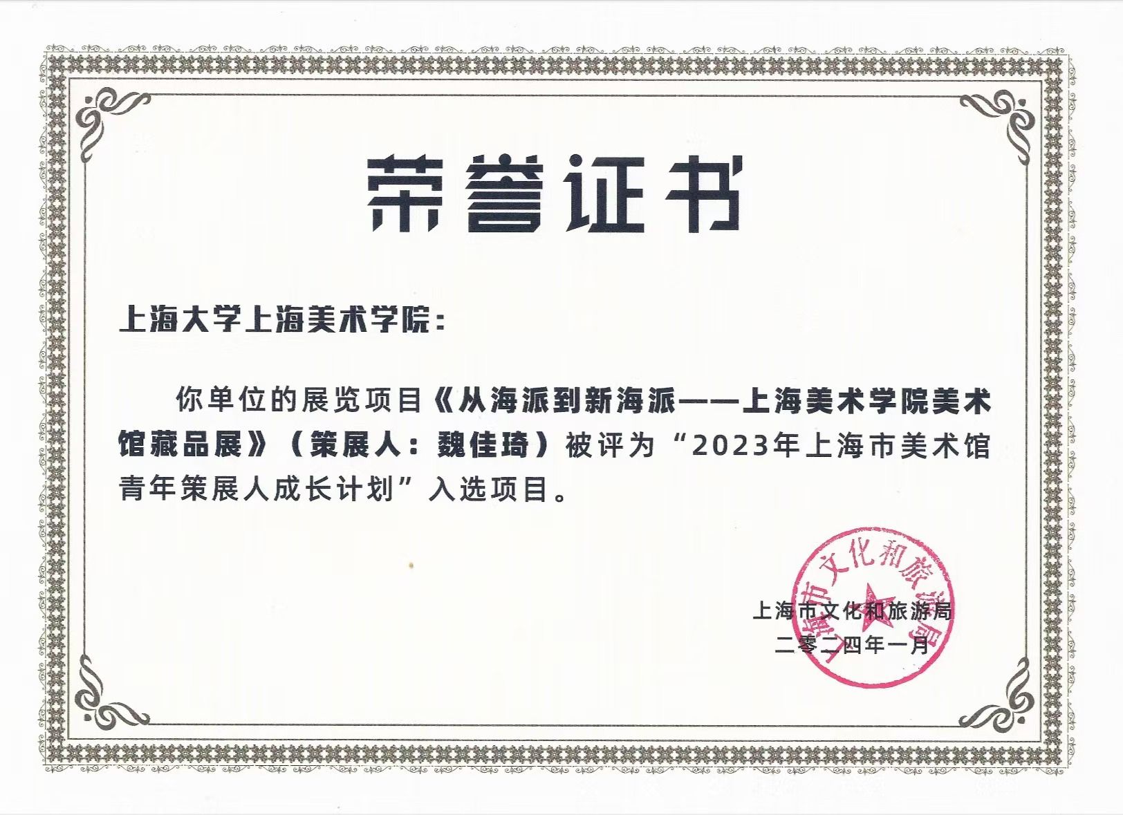 作为高校美术馆,上海美术学院美术馆不仅是展示和研究艺术的场所,也是培养艺术人才的重要基地。其与学院教学结合,为青年教师和学生提供了理论与实践相融合的教育环境。上海美术学院美术馆的“尚一墨 迭代蜕变新海派——上海美术学院青年教师作品研究展”荣登文化和旅游部颁发的2023年全国美术馆青年策展人扶持计划初评入选项目和2023年上海市美术馆光荣榜。上海美术学院美术馆的《从海派到新海派——上海美术学院美术馆藏品展》(策展人:魏佳琦)被评为“2023年上海市美术馆青年策展人成长计划”入选项目。上海美术学院博士研究生周美珍、袁小力组成策展团队,《从海派到新海派艺术社区实践展》入选“解构·重塑·赋魅”青年策展人主题联展。