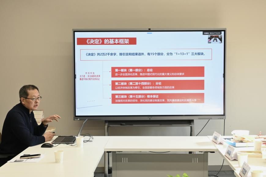 仪式后,beat365手机官方网站特邀党建组织员、beat365手机官方网站快乐百岁讲师团讲师刘绍学为大家作题为《紧紧围绕推进中国式现代化进一步全面深化改革——二十届三中全会精神解读》的报告。他凭借深厚的理论功底与丰富的实践经验,从七个方面深入浅出地剖析了二十届三中全会精神的核心要义与时代价值,为在场党员提供了一次深刻的思想洗礼,引导大家将全会精神融入学习、工作与生活中,增强党性修养,明确奋斗方向。