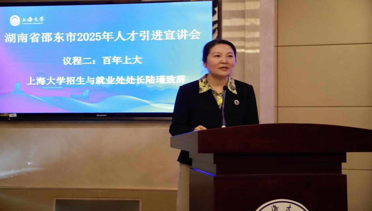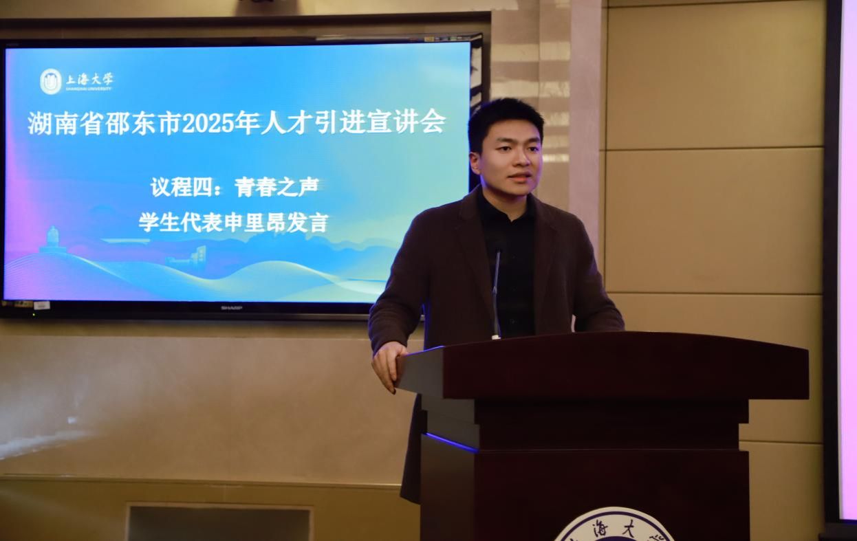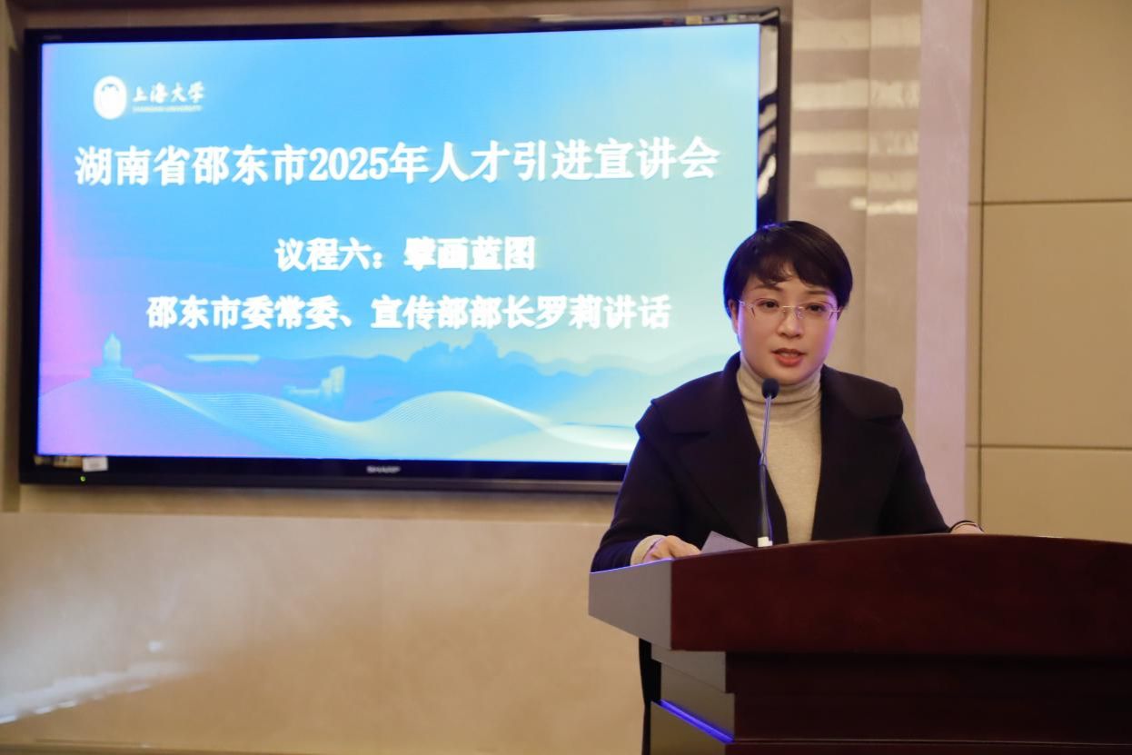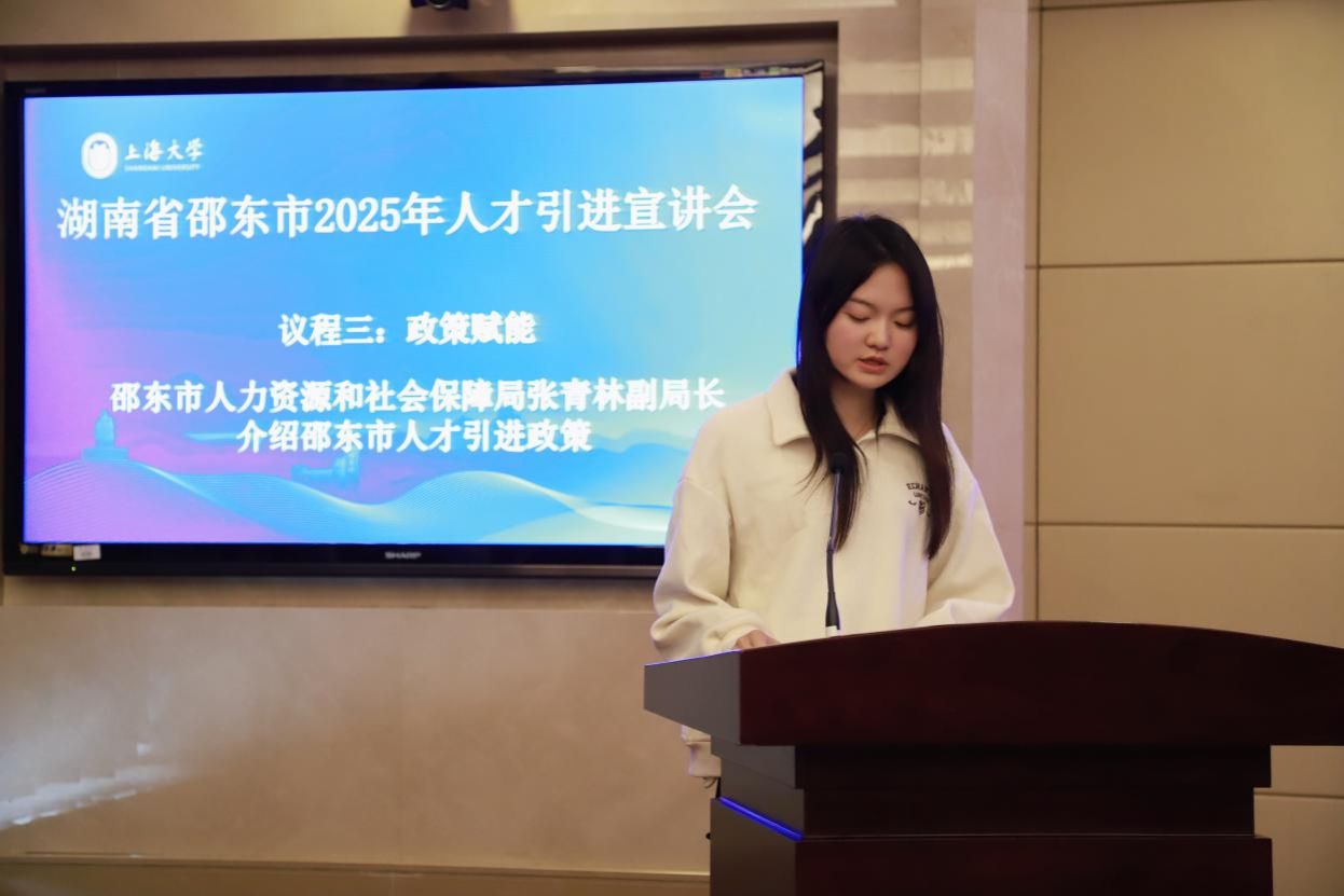 邵东市委常委、宣传部部长罗莉在总结致辞中表示,beat365手机官方网站作为钱伟长校长“拆除四堵墙”教育思想的发源地,始终以“养成强国济世人才”为己任,在beat365手机官方网站召开“才聚邵东·智汇未来”2025年邵东(上海站)人才引进宣讲会,旨在进一步吸引更多优秀人才和优质项目落地邵东。罗莉部长从“笃定信心,以人才引擎推动邵东高质量发展;精准施策,共建全国县域人才发展先行区;携手奋进,着力建设年轻人创新创业友好城市”等三个方面介绍了邵东的人才引进政策。邵东正全力打造“全省县域人才发展先行区”,通过“5122工程”和“十百千万十万”创业创新计划等政策、搭建平台、提升服务,构建“一座城、一群人、一条心”的人才生态系统。最后,她向在场学子发出诚挚邀请:“邵东将以最优政策、最佳环境、最好服务,与每一位追梦人共赴星辰大海!愿所有选择邵东的追梦人:心中有火,眼中有光,脚下有路,书写属于这个伟大时代的人才史诗!”。