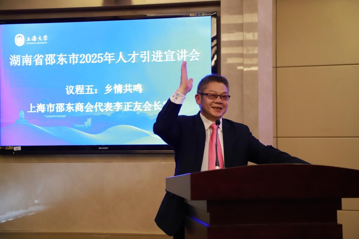 在沪邵东籍企业家代表、寿彭(上海)健康咨询有限公司总经理李正友以“树高千尺不忘根”为主题发表感言。通过介绍邵东市人文、产业、社会等方面日新月异的变化,展示了邵东的快速发展与独特魅力。同时,他呼吁在沪企业家和学子关注家乡发展,并表示将全力搭建资源对接平台,推动人才、技术、资本“反哺”邵东。