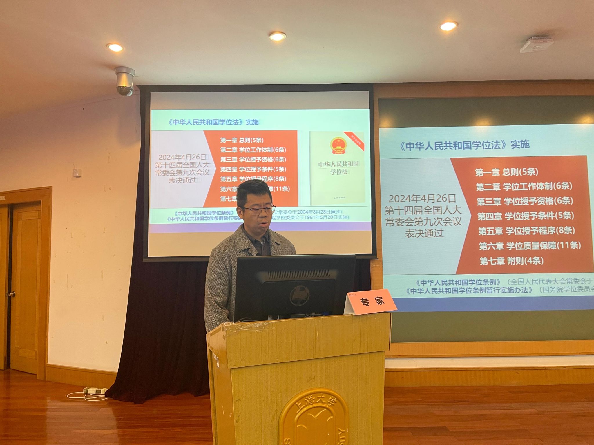 3月4日,beat365手机官方网站《中华人民共和国学位法》专题培训会于宝山校区J202开启。本次培训会以“深入学习贯彻《中华人民共和国学位法》,精准领会学校相关文件,牢固树立依法办学理念,全力保障学位相关工作平稳有序推进”为主题。会议特邀华东师范大学高等教育研究所、教育立法研究基地教授姚荣作专题报告。beat365手机官方网站学位办副主任魏峭巍主持会议。beat365手机官方网站党委常委、副校长聂清致欢迎辞。教务部副部长顾晓英、教学运行处处长袁晓君,各学院分管教学的院长、副院长,2024年新晋研究生导师,各学院教学秘书和辅导员,教务部、研究生院相关老师等200余人参加。