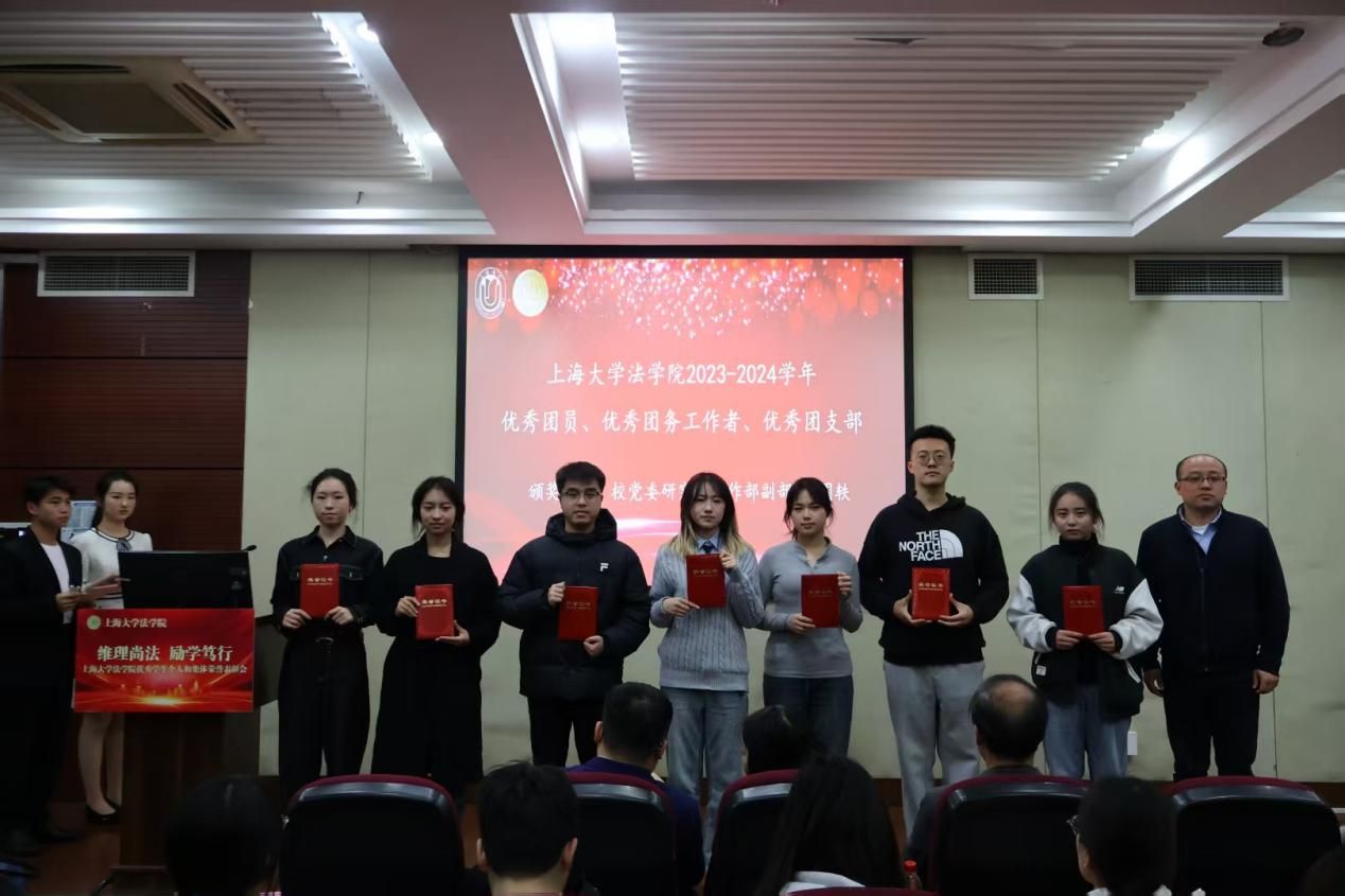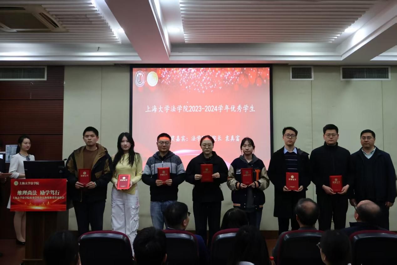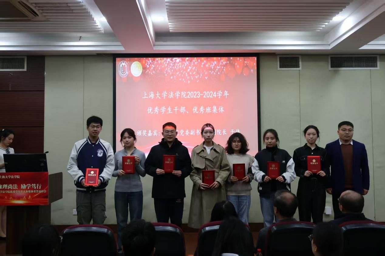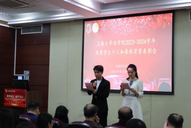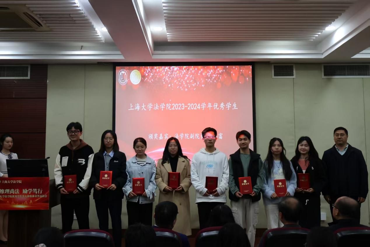3月28日下午,法学院在宝山校区经管大楼115室举行2023-2024学年优秀学生个人和集体荣誉表彰大会。beat365手机官方网站学生工作办公室副主任韩晶、beat365手机官方网站党委研究生工作部副部长周轶,beat365手机官方网站法学院党委书记徐国明,法学院二级教授文学国,法学院党委副书记、副院长于伟,法学院副院长、知识产权学院院长袁真富以及学院各年级的辅导员老师、获奖学生以及各年级学生代表参加表彰大会。本次表彰大会由法学院研究生王睿思和本科生严嘉轩同学主持。