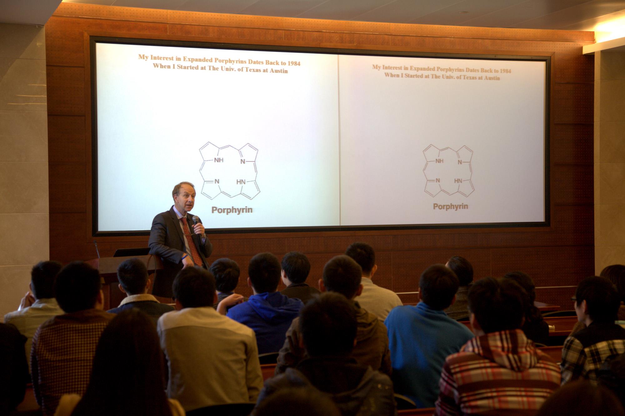 Sessler教授的报告生动且充满激情,并巧妙融入了许多有趣的笑话,使得晦涩难懂的化学、生物学和药学知识变得通俗易懂。在整个报告过程中Sessler教授特别强调了失败是成功的原动力,以及兴趣是问题提出的基础这两个做研究的根本问题。他的报告使老师和同学们深刻体会到大师的成功之路也是通过不断挑战自我而实现的。