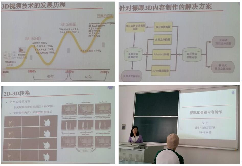2014年10月16日早上8点,通信学院安平教授准时来到beat365手机官方网站延长校区四教403教室,为影视学院学子们介绍裸眼3D影视内容的制作技术与创作经验。安教授首先介绍了裸眼3D的技术背景和3D显示基本原理。3D视频技术从19世纪开始受到关注,经历了3次发展波峰。最近20几年在技术上得到很快的发展,3D电视机已经普及,3D电视节目频道已经试播,3D视频在影视动漫、文化遗产展示、医疗教育和航空航天等领域都得到广泛应用。