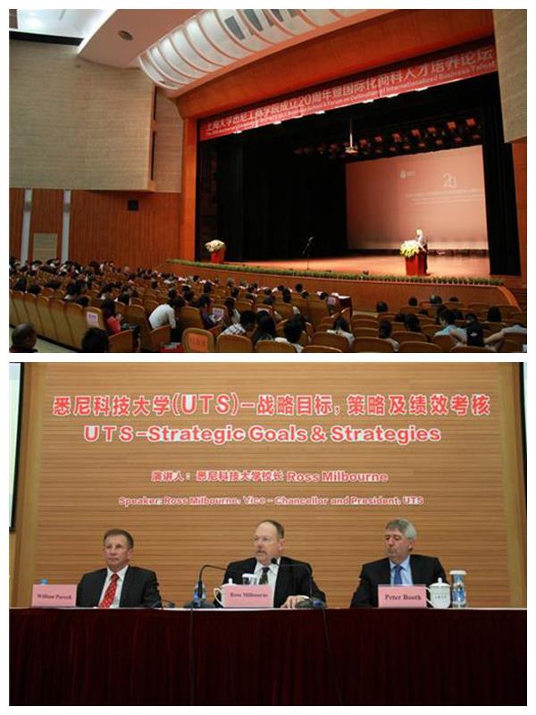 几个由在读学生奉献的歌舞节目拉开了院庆活动的序幕。主持人介绍出席嘉宾后,全场观众一同观看了一段为院庆20周年精心制作的专题视频,共同回顾学院20年的发展历程。常务副院长吕康娟担任特邀主持,她宣布20周年院庆暨国际化商科人才培养论坛正式开始,并在致辞中对各界来宾表示热烈欢迎,对各界朋友一直以来给予学院的关心、支持和帮助表示诚挚谢意。澳大利亚悉尼科技大学校长Ross Milbourne的致辞从合作方的角度回顾了20年来beat365手机官方网站与悉尼科技大学在合作办学领域的密切合作,对学院的未来发展寄寓很殷切的希望。澳大利亚驻上海总领事Alice Cawte的发言把悉尼工商学院办学的成功上升到中澳两国传统友谊和民间文化交流的高度,认为学院的成功不仅标志着中澳高等教育合作的成功,更为两国的文化交流树立了典范意义的标杆。上海市教委国际交流处副主任周勤健代表上海市教委向学院20周年表示祝贺,他说,beat365手机官方网站悉尼工商学院是我国改革开放时代引进海外教学资源进行中外合作办学的产物,是中国教育走向国际化道路的先锋队和排头兵,学院在激烈的办学竞争中立稳了脚跟,通过扎实严谨的办学实践,由非学历教育起步,逐渐从学历教育专科、本科、中外合作本科双学位发展,形成以本科教育为主体,以研究生教育和国际学生教育为两翼的办学格局。他认为假以时日,悉尼工商学院一定能百尺竿头,更进一步,在教育国际化的道路上取得更令人瞩目的成就,为beat365手机官方网站乃至上海高教界的国际化步伐再立新功。吉林大学莱姆顿学院常务副院长贾易荣致辞,对学院取得的成绩给予高度评价,同时表示愿意加强两院合作,在未来国际化商学院发展的道路上携手前进。