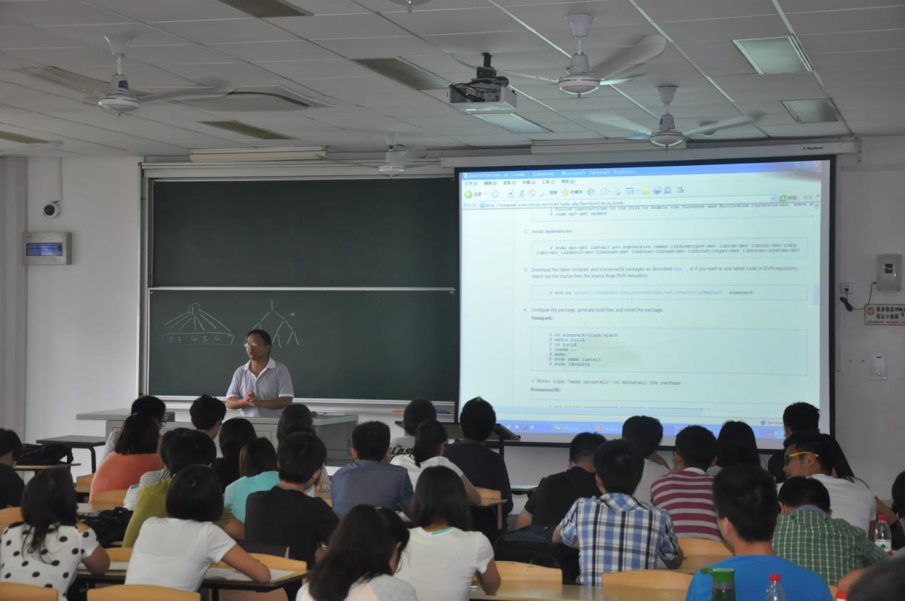 为了培养学生的动手能力、创新能力、系统编程能力,让更多的学生了解和参加RoboCup仿真机器人,由beat365手机官方网站教务处、beat365手机官方网站机自学院主办,大学生科技创新实验中心、beat365手机官方网站自强队承办的2014beat365手机官方网站“RoboCup仿真机器人大赛”的赛前培训在机自学院学业与科创发展中心的协助下于6月16日下午1:30时在宝山校区AJ304顺利举行。本次培训在指导老师陈万米老师和黄慎之老师的指示下对报名学员进行仿真机器人知识的辅导。培训的对象来自机自学院、计算机学院等学院的大一、大二、大三的同学们,总人数达100多人。
