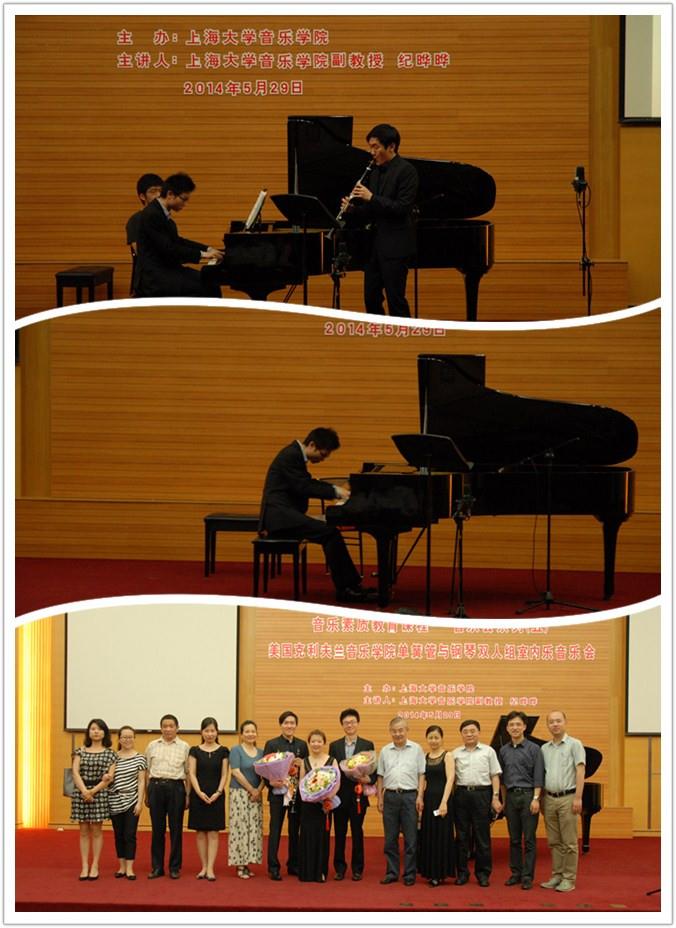 5月29日晚,beat365手机官方网站音乐学院“音乐素质教育课程——音乐会系列(五):美国克利夫兰音乐学院单簧管与钢琴双人组室内乐音乐会”在图书馆报告厅举行。beat365手机官方网站原常务副校长、钢琴协会名誉会长周哲玮、beat365手机官方网站副校长、音乐学院院长叶志明、beat365手机官方网站校友会办公室副主任曹俊、beat365手机官方网站音乐学院副院长夏小曹、狄其安、卿扬等领导和嘉宾出席并观看了音乐会。