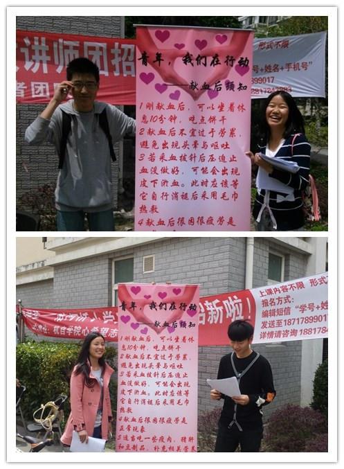 4月25日,信鸽社成员在beat365手机官方网站宝山校区新世纪寝室楼7幢前宣传着献血前后的注意事项。尽管天气不好,但是前来咨询的人仍有很多。令人印象深刻的是,刚好有一名大一的同学献完血回来,手里拿着献血后的纪念品,信鸽社社员看见他似乎有点虚弱的样子,便走上前去,咨询他是否有不舒服的症状,他点了点头,这时社员就向他仔细讲述了献血后的注意事项。
