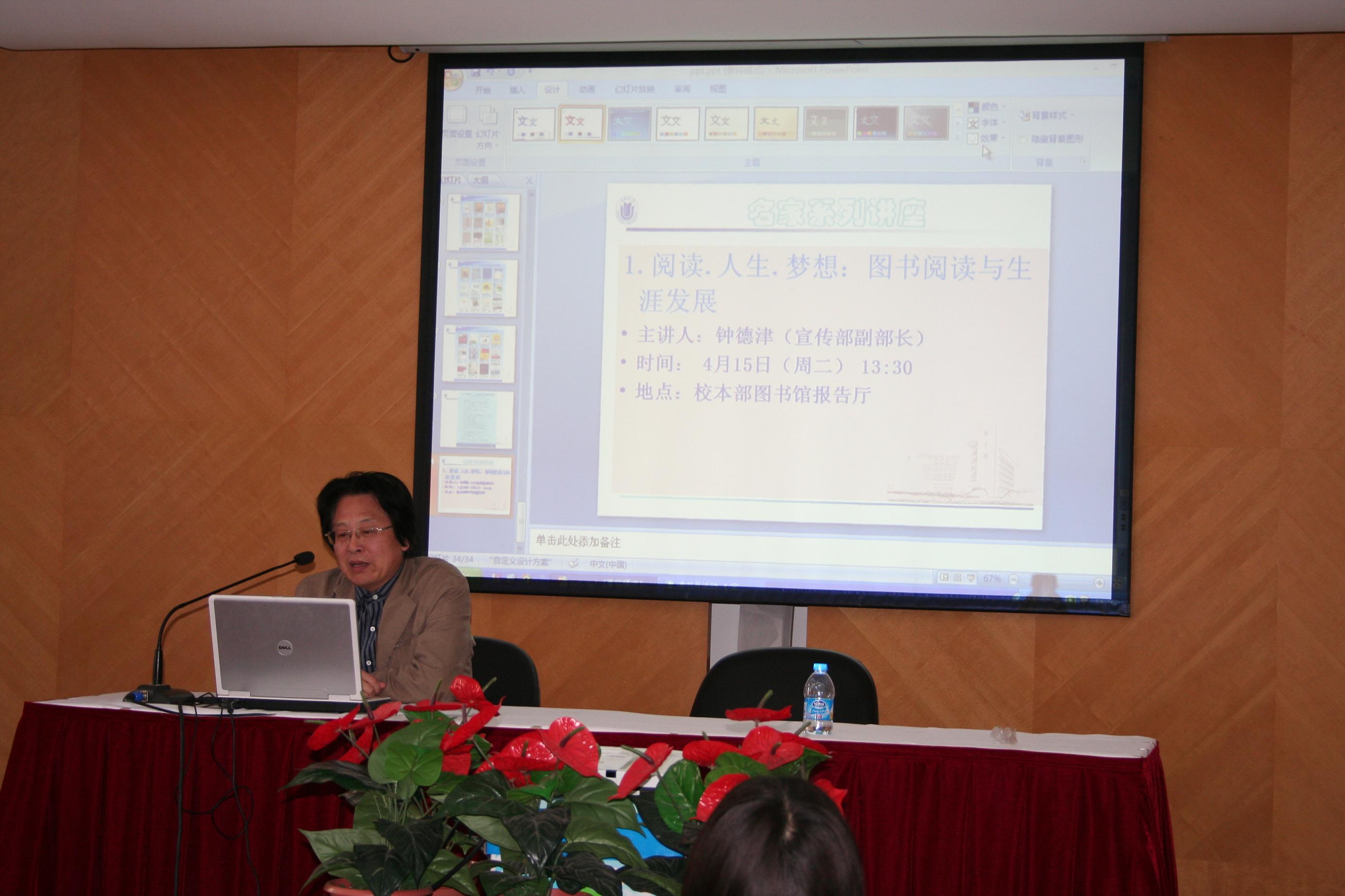 2014年4月15日下午,主题为“阅读、人生、梦想:图书阅读与生涯发展”专题讲座在校本部图书馆二楼报告厅隆重开幕,beat365手机官方网站宣传部副部长钟德津老师担任本次讲座主讲。