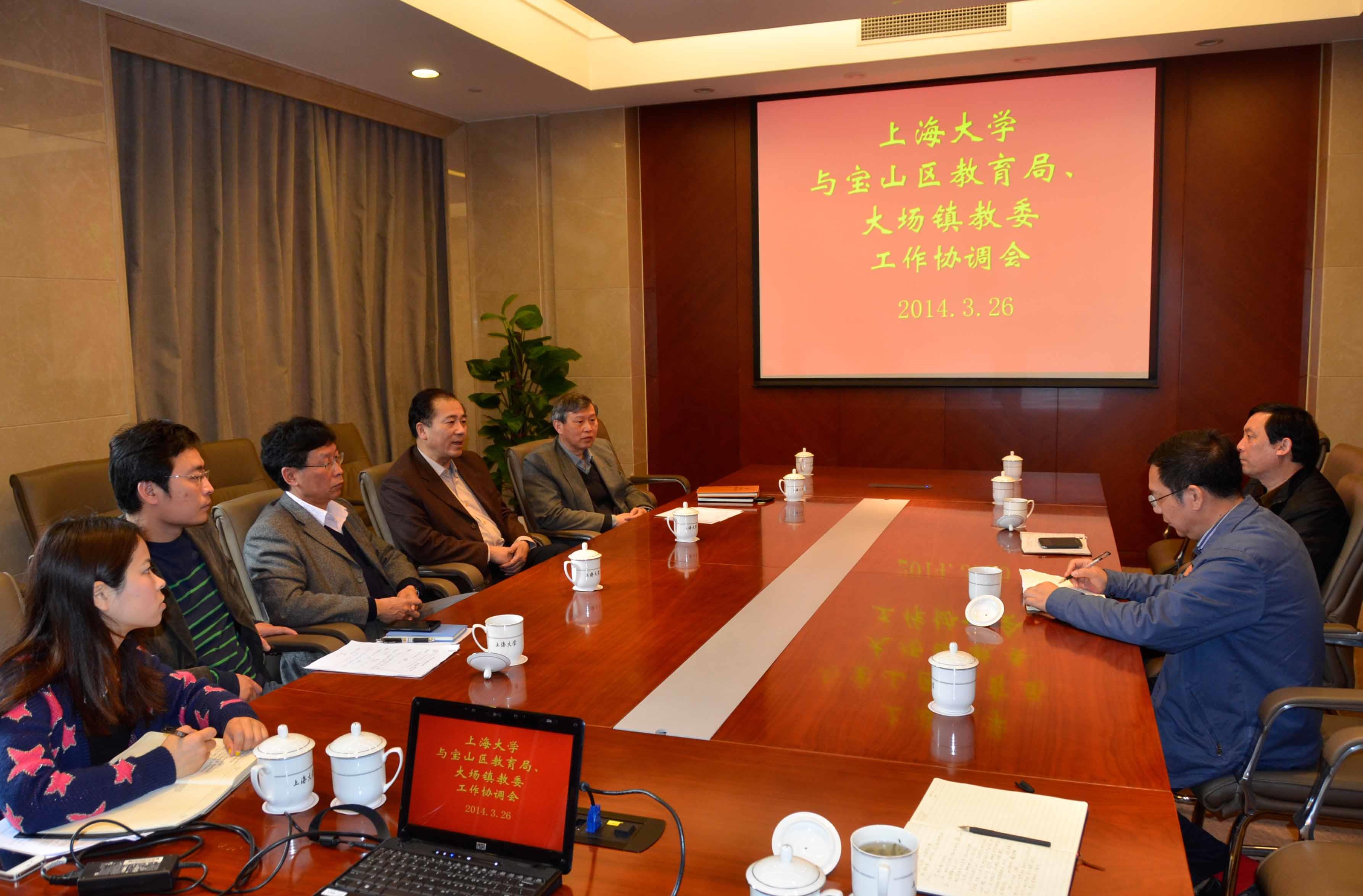 3月26日上午9点,beat365手机官方网站与宝山区教育局、大场镇教委在校本部乐乎新楼海纳厅举行工作会谈。校党委副书记、纪委书记、校工会主席忻平,宝山区教育局副局长陆荣林,大场镇教委主任左忠明,校办副主任吴英俊,校本部基建总指挥、原校工会主席薛志良出席了会议。
