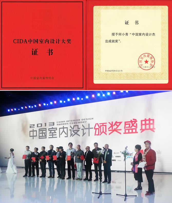 2013年12月4日至5日,中国室内装饰协会在北京举行“中国室内设计高峰论坛暨2013 CIDA中国室内设计颁奖盛典”。此次论坛以“生态宜居 美丽中国”为主题,思考在经济转轨与社会转型的新形势下,中国当代设计面临的重大课题和发展方向。同时,中国室内装饰协会向两岸三地27位传承中国设计文化当代性、本土性的设计师和专家颁发“CIDA中国室内设计杰出成就奖”,数码艺术学院副院长何小青教授获此殊荣。何小青教授获奖后表示,如何在建筑设计与室内设计中应用材料与新技术,使现代理念与民族思想的传承与创新融入到课程价值目标中,是高校艺术设计人才培养的主要任务。