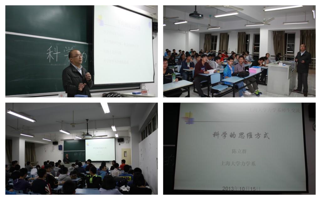 10月15号晚上6点,“力学教授讲坛”第3讲报告会在beat365手机官方网站本部A303举行。beat365手机官方网站力学系陈立群教授应邀为部分社区学院2013级新生和力学系本科生做了题为 “科学的思维方法”的科技前沿报告。