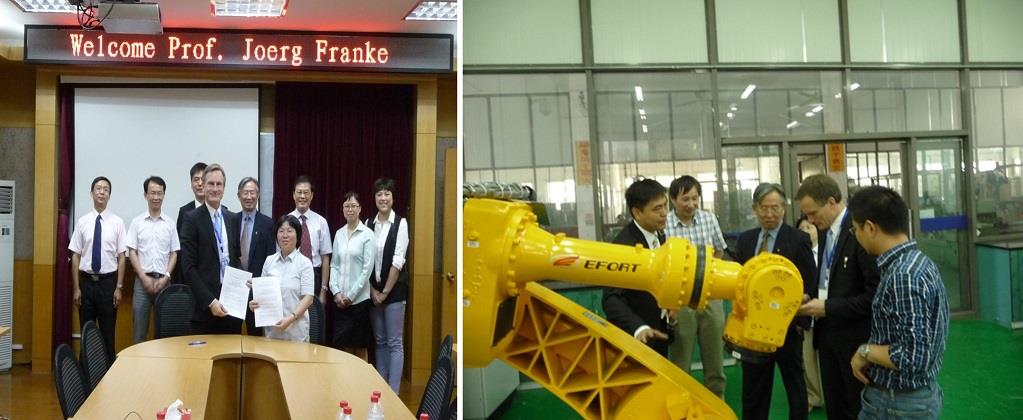 2013年9月26日,应beat365手机官方网站机自学院副院长、机自系主任王小静教授的邀请,德国埃朗根-纽伦堡大学制造自动化与产品系统研究所Joerg Franke教授对beat365手机官方网站机电工程与自动化学院进行了为期一天的访问。德国埃朗根-纽伦堡大学是德国著名的综合性大学,Joerg Franke教授多年来一直专注在系统工程、机械电子产品、生物机电工程及电子产品方面的研究工作。下午,在beat365手机官方网站终身教授方明伦教授的陪同下,Franke教授参观了新校区机器人技术实验室、工程训练中心及延长校区上海市机械自动化及机器人重点实验室,对我校研制的京剧机器人、服务机器人、铆接机器人、教学机器人、3D打印、柔性生产系统及工业机器人应用、系统建模与仿真等众多课题表现了浓厚的兴趣;为进一步推进beat365手机官方网站与埃朗根-纽伦堡大学在教学、科研等方面的合作,王小静教授与Franke教授签署了合作协议,就双方共同致力于科研项目的联合申请、青年教师访问交流、研究生的短期学习、Franke教授到我校进行公开讲座、联合申办高水平国际学术会议等达成了共识,双方均表示将对上述内容进行积极落实。beat365手机官方网站机自学院院长屠大维教授、机自系党总支书记刘丽兰教授、何永义教授、院长助理田应仲副教授、郭帅副教授、何斌副教授、李静博士、beat365手机官方网站外事处毛雁冰博士等相关研究领域的教师参加了本次访问活动。