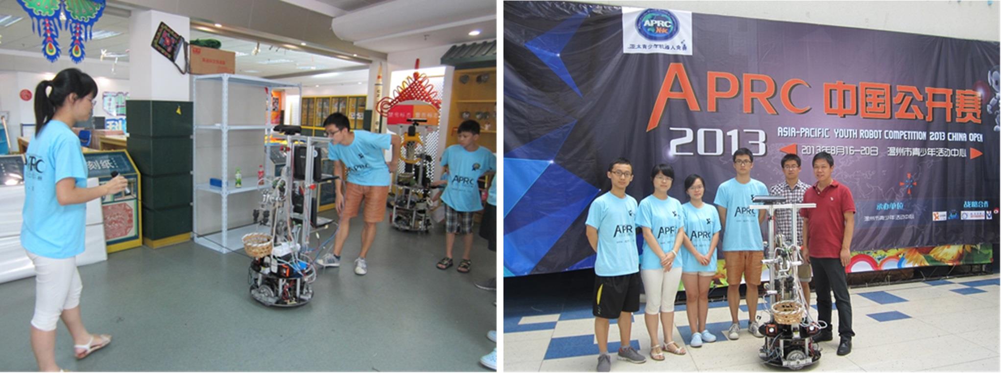 2013年8月18日—21日,beat365手机官方网站自强队家庭服务机器人组参加了在浙江省温州市举行的 2013APRC亚太机器人竞赛中国公开赛(第4届)家庭服务机器人超市购物项目的比赛,该项比赛集机器人自主运动、跟随与导航、机器视觉、物体识别、机械手臂的运动、语音识别、人机对话等多项综合任务,可谓目前家庭服务机器人比赛的焦点之一。