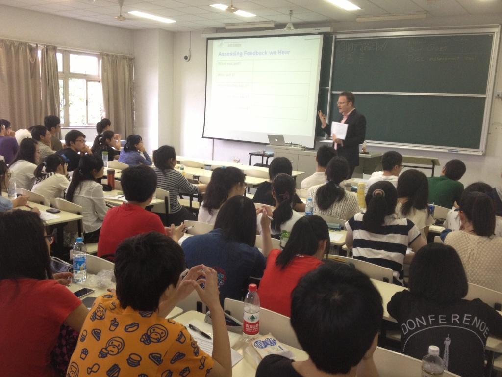 在一段轻松幽默的开场白后,Matthew先生用一张图片告诉学生们职业的三种基础分类方式“Love”、“Good at”、“Pays”,并告诉大家:很多人理想的职业是love & good at,然而大多数人在做的职业却是pays & good at,这就是没有为自己做好职业规划的结果。Matthew先生此刻给大家分发了表格并抛出了一个问题:当你觉得时光飞逝时你在做什么?以此要大家首先写出大家喜欢做的事情。同学们所写内容多为阅读、写作、烹饪、交际等。在了解大家的喜好之后,Matthew补充了问题的后半段:你喜欢的事情对社会价值有贡献吗?并指出符合问题要求的喜好相对更有价值。在大家相继完成了全部表格之后,Matthew表示这个实验是为了让大家更好的了解自己的性格特征,并强调这对于每个人的职业规划是十分重要的。在大家相继分享了自己的喜好之后,Matthew向大家推荐一本书并希望大家能从中获益。Matthew在此时分享了他作为一名服务公司的创始人对市场的了解:想要在这个市场里获得成功,最重要的一点就是要时刻提供最好的客户服务。只有不懈的努力和更多的为他人着想才能离成功更近。同时,细心体会别人对你的反馈也是完善自己的重要一点。说到这里,他以握手这一细节举例,让大家了解社交场合中的礼仪细节冰了解其重要性,并与全体到场同学友好握手。本次讲座就在轻松愉快的气氛中圆满完成。