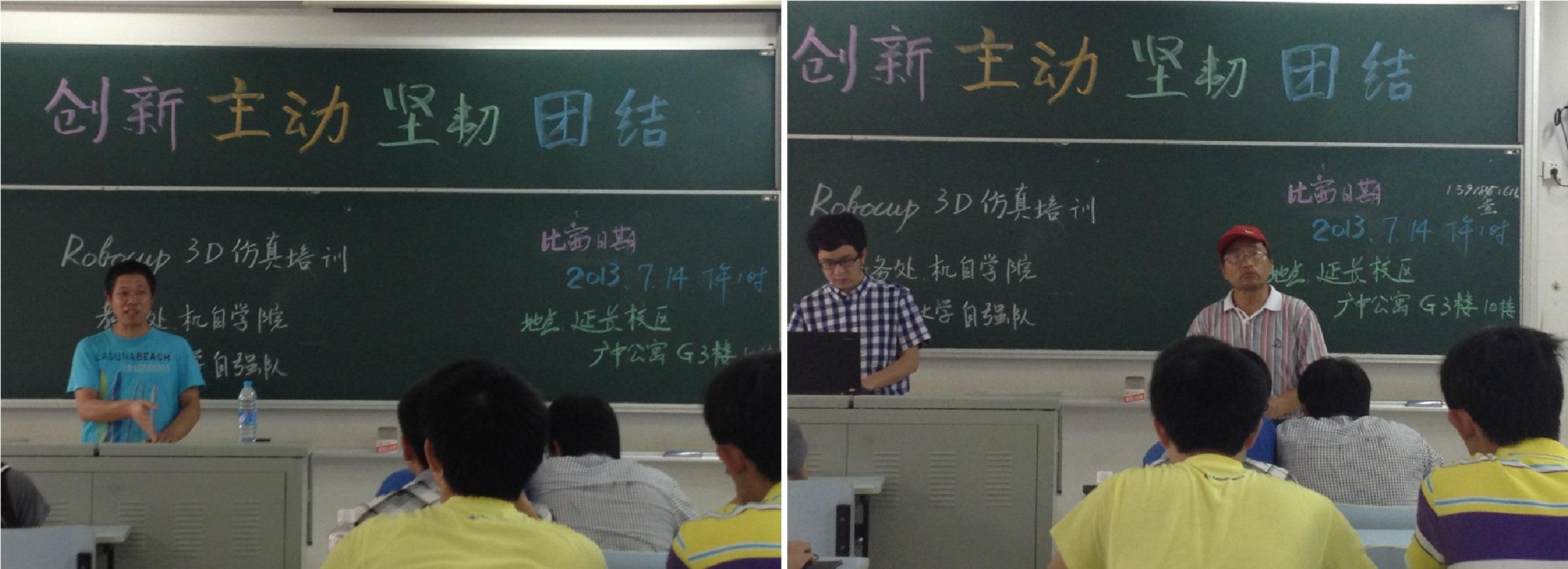下午1点,前不久刚从澳大利亚作为访问学者回国的中国自动化学会机器人竞赛工作委员会副主任、beat365手机官方网站特级技术总监、自强队的指导老师陈万米特地前来参加交流讨论。陈老师给同学们介绍了机器人大赛在国际国内的发展状况,以及beat365手机官方网站机器人自强队的发展历程,并鼓励大家发扬自强队的队训:创新、主动、坚韧、团结的精神,积极准备仿真比赛。随后,自强队指导老师黄慎之向同学们公布了2013beat365手机官方网站RoboCup机器人仿真大赛的具体时间、地点及比赛形式。